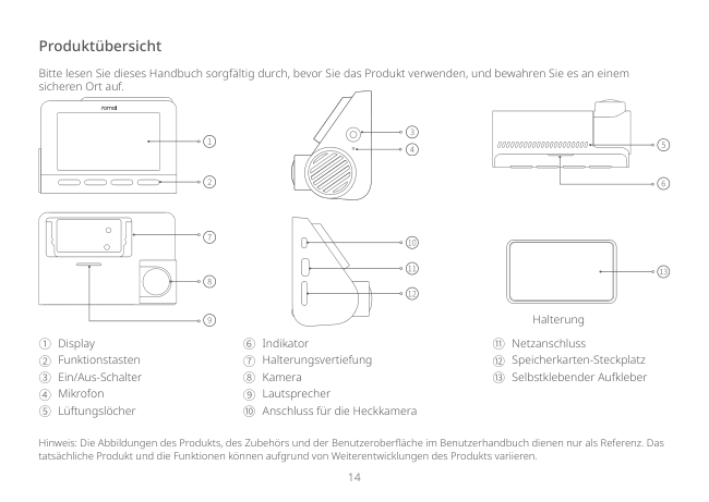 14 Produktübersicht Hinweis: Die Abbildungen des Produkts, des Zubehörs und der Benutzeroberfläche im Benutzerhandbuch dienen nur als Referenz. Das tatsächliche Produkt und die Funktionen können aufgrund von Weiterentwicklungen des Produkts variieren. Bitte lesen Sie dieses Handbuch sorgfältig durch, bevor Sie das Produkt verwenden, und bewahren Sie es an einem sicheren Ort auf. ① Display ② Funktionstasten ③ Ein/Aus-Schalter ④ Mikrofon ⑤ Lüftungslöcher Halterung ⑥ Indikator ⑦ Halterungsvertiefung ⑧ Kamera ⑨ Lautsprecher ⑩ Anschluss für die Heckkamera ⑪ Netzanschluss ⑫ Speicherkarten-Steckplatz ⑬ Selbstklebender Aufkleber
