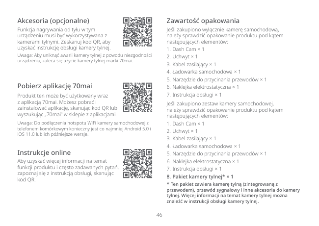 46 Pobierz aplikację 70mai Produkt ten może być użytkowany wraz z aplikacją 70mai. Możesz pobrać i zainstalować aplikację, skanując kod QR lub wyszukując „70mai” w sklepie z aplikacjami. Uwaga: Do podłączenia hotspotu WiFi kamery samochodowej z telefonem komórkowym konieczny jest co najmniej Android 5.0 i iOS 11.0 lub ich późniejsze wersje. Akcesoria (opcjonalne) Funkcja nagrywania od tyłu w tym urządzeniu musi być wykorzystywana z kamerami tylnymi. Zeskanuj kod QR, aby uzyskać instrukcję obsługi kamery tylnej. Uwaga: Aby uniknąć awarii kamery tylnej z powodu niezgodności urządzenia, zaleca się użycie kamery tylnej marki 70mai. Instrukcje online Aby uzyskać więcej informacji na temat funkcji produktu i często zadawanych pytań, zapoznaj się z instrukcją obsługi, skanując kod QR. Zawartość opakowania Jeśli zakupiono wyłącznie kamerę samochodową, należy sprawdzić opakowanie produktu pod kątem następujących elementów: