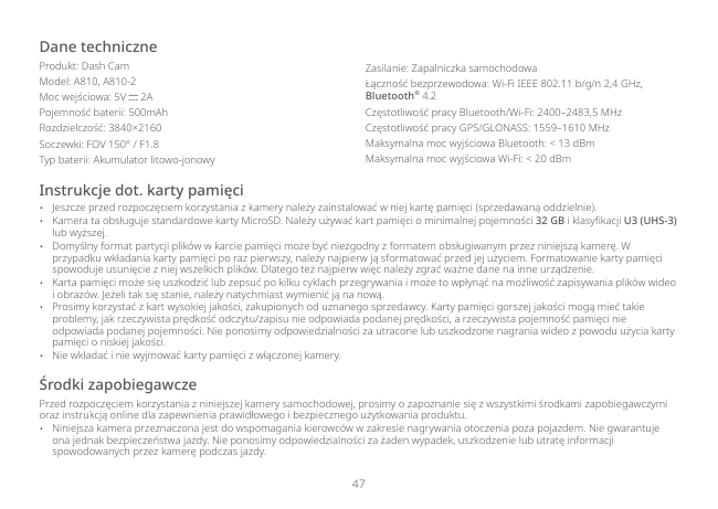 47 Środki zapobiegawcze Przed rozpoczęciem korzystania z niniejszej kamery samochodowej, prosimy o zapoznanie się z wszystkimi środkami zapobiegawczymi oraz instrukcją online dla zapewnienia prawidłowego i bezpiecznego użytkowania produktu.