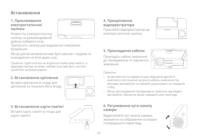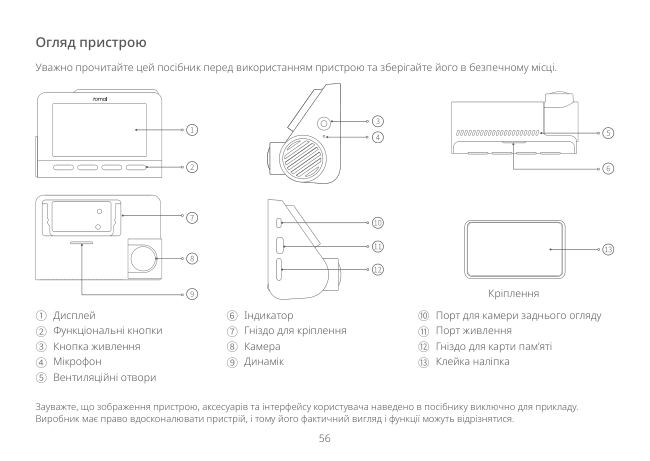 56 Огляд пристрою Зауважте, що зображення пристрою, аксесуарів та інтерфейсу користувача наведено в посібнику виключно для прикладу. Виробник має право вдосконалювати пристрій, і тому його фактичний вигляд і функції можуть відрізнятися. Уважно прочитайте цей посібник перед використанням пристрою та зберігайте його в безпечному місці. ① Дисплей ② Функціональні кнопки ③ Кнопка живлення ④ Мікрофон ⑤ Вентиляційні отвори Кріплення ⑥ Індикатор ⑦ Гніздо для кріплення ⑧ Камера ⑨ Динамік ⑩ Порт для камери заднього огляду ⑪ Порт живлення ⑫ Гніздо для карти пам’яті ⑬ Клейка наліпка