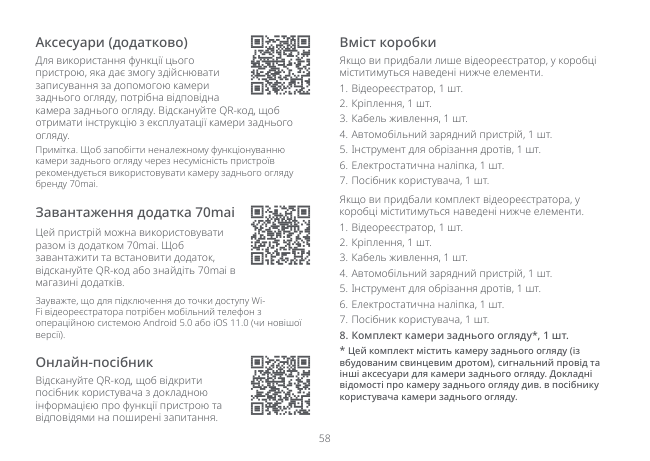 58 Завантаження додатка 70mai Цей пристрій можна використовувати разом із додатком 70mai. Щоб завантажити та встановити додаток, відскануйте QR-код або знайдіть 70mai в магазині додатків. Зауважте, що для підключення до точки доступу Wi- Fi відеореєстратора потрібен мобільний телефон з операційною системою Android 5.0 або iOS 11.0 (чи новішої версії). Аксесуари (додатково) Для використання функції цього пристрою, яка дає змогу здійснювати записування за допомогою камери заднього огляду, потрібна відповідна камера заднього огляду. Відскануйте QR-код, щоб отримати інструкцію з експлуатації камери заднього огляду. Примітка. Щоб запобігти неналежному функціонуванню камери заднього огляду через несумісність пристроїв рекомендується використовувати камеру заднього огляду бренду 70mai. Онлайн-посібник Відскануйте QR-код, щоб відкрити посібник користувача з докладною інформацією про функції пристрою та відповідями на поширені запитання. Вміст коробки Якщо ви придбали лише відеореєстратор, у коробці міститимуться наведені нижче елементи.