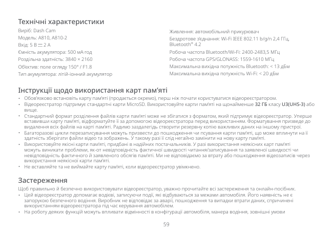 Ємність акумулятора: 500 мА·год Роздільна здатність: 3840 × 2160 Об’єктив: поле огляду 150° / F1.8 Тип акумулятора: літій-іонний акумулятор Інструкції щодо використання карт пам’яті60 тощо. Перебої з живленням, використання за межами діапазону допустимої температури чи рівня вологості, зіткнення або пошкодження карти пам’яті можуть спричинити порушення в роботі відеореєстратора. Виробник не гарантує, що відеореєстратор нормально функціонуватиме за всіх умов. Відеозаписи з цього реєстратора носять виключно інформативний характер.