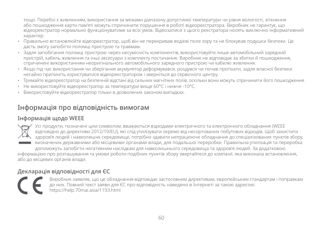 59 Застереження Щоб правильно й безпечно використовувати відеореєстратор, уважно прочитайте всі застереження та онлайн-посібник.