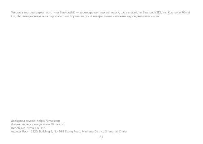 61 Довідкова служба: [email protected] Додаткова інформація: www.70mai.com Виробник: 70mai Co., Ltd. Адреса: Room 2220, Building 2, No. 588 Zixing Road, Minhang District, Shanghai, China Текстова торгова марка і логотипи Bluetooth® — зареєстровані торгові марки, що є власністю Bluetooth SIG, Inc. Компанія 70mai Co., Ltd. використовує їх за ліцензією. Інші торгові марки й товарні знаки належать відповідним власникам.