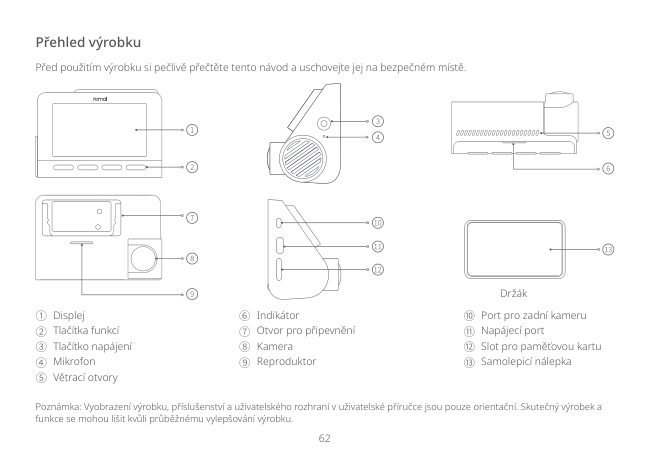 62 Přehled výrobku Poznámka: Vyobrazení výrobku, příslušenství a uživatelského rozhraní v uživatelské příručce jsou pouze orientační. Skutečný výrobek a funkce se mohou lišit kvůli průběžnému vylepšování výrobku. Před použitím výrobku si pečlivě přečtěte tento návod a uschovejte jej na bezpečném místě. ① Displej ② Tlačítka funkcí ③ Tlačítko napájení ④ Mikrofon ⑤ Větrací otvory Držák ⑥ Indikátor ⑦ Otvor pro připevnění ⑧ Kamera ⑨ Reproduktor ⑩ Port pro zadní kameru ⑪ Napájecí port ⑫ Slot pro paměťovou kartu ⑬ Samolepicí nálepka