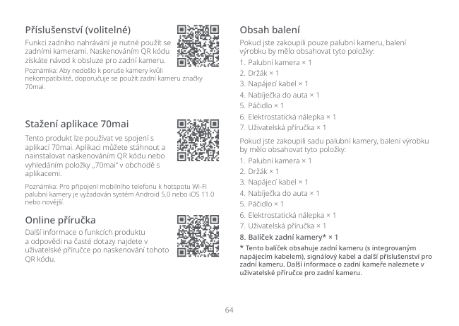 64 Stažení aplikace 70mai Tento produkt lze používat ve spojení s aplikací 70mai. Aplikaci můžete stáhnout a nainstalovat naskenováním QR kódu nebo vyhledáním položky „70mai“ v obchodě s aplikacemi. Poznámka: Pro připojení mobilního telefonu k hotspotu Wi-Fi palubní kamery je vyžadován systém Android 5.0 nebo iOS 11.0 nebo novější. Příslušenství (volitelné) Funkci zadního nahrávání je nutné použít se zadními kamerami. Naskenováním QR kódu získáte návod k obsluze pro zadní kameru. Poznámka: Aby nedošlo k poruše kamery kvůli nekompatibilitě, doporučuje se použít zadní kameru značky 70mai. Online příručka Další informace o funkcích produktu a odpovědi na časté dotazy najdete v uživatelské příručce po naskenování tohoto QR kódu. Obsah balení Pokud jste zakoupili pouze palubní kameru, balení výrobku by mělo obsahovat tyto položky: