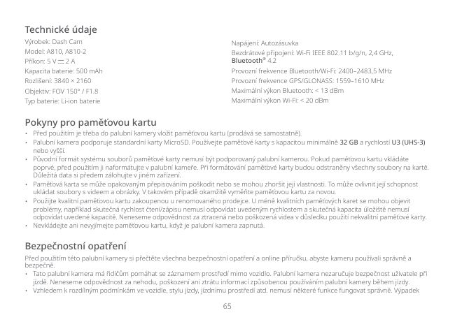 65 Bezpečnostní opatření Před použitím této palubní kamery si přečtěte všechna bezpečnostní opatření a online příručku, abyste kameru používali správně a bezpečně.
