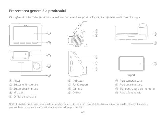 68 Prezentarea generală a produsului Notă: Ilustrațiile produsului, accesoriile și interfața pentru utilizator din manualul de utilizare au rol numai de referință. Funcțiile și produsul efectiv pot varia datorită îmbunătățirilor aduse produsului. Vă rugăm să citiți cu atenție acest manual înainte de a utiliza produsul și să păstrați manualul într-un loc sigur. ① Afișaj ② Butoane funcționale ③ Buton de alimentare ④ Microfon ⑤ Orificii de ventilare Suport ⑥ Indicator ⑦ Fantă suport ⑧ Cameră ⑨ Difuzor ⑩ Port cameră spate ⑪ Port de alimentare ⑫ Slot pentru card de memorie ⑬ Autocolant adeziv