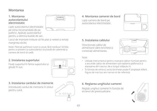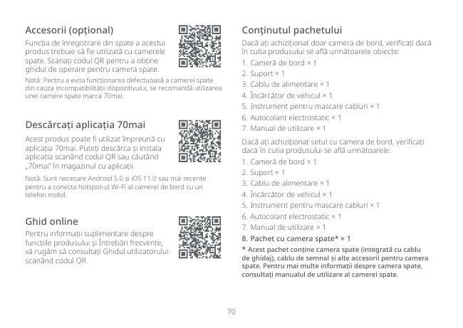 70 Descărcați aplicația 70mai Acest produs poate fi utilizat împreună cu aplicația 70mai. Puteți descărca și instala aplicația scanând codul QR sau căutând „70mai” în magazinul cu aplicații. Notă: Sunt necesare Android 5.0 și iOS 11.0 sau mai recente pentru a conecta hotspot-ul Wi-Fi al camerei de bord cu un telefon mobil. Accesorii (opțional) Funcția de înregistrare din spate a acestui produs trebuie să fie utilizată cu camerele spate. Scanați codul QR pentru a obține ghidul de operare pentru camera spate. Notă: Pentru a evita funcționarea defectuoasă a camerei spate din cauza incompatibilității dispozitivului, se recomandă utilizarea unei camere spate marca 70mai. Ghid online Pentru informații suplimentare despre funcțiile produsului și Întrebări frecvente, vă rugăm să consultați Ghidul utilizatorului scanând codul QR. Conținutul pachetului Dacă ați achiziționat doar camera de bord, verificați dacă în cutia produsului se află următoarele obiecte: