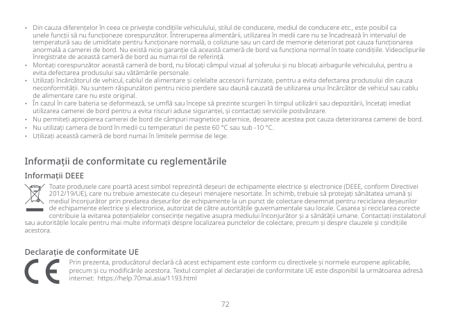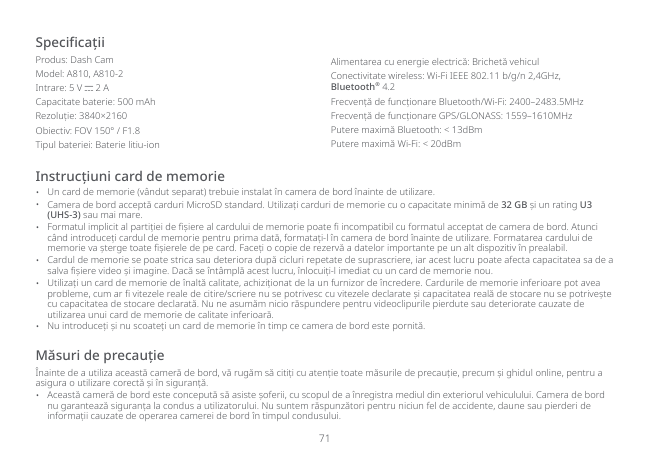71 Măsuri de precauție Înainte de a utiliza această cameră de bord, vă rugăm să citiți cu atenție toate măsurile de precauție, precum și ghidul online, pentru a asigura o utilizare corectă și în siguranță.