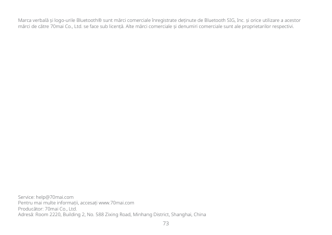73 Service: [email protected] Pentru mai multe informații, accesați www.70mai.com Producător: 70mai Co., Ltd. Adresă: Room 2220, Building 2, No. 588 Zixing Road, Minhang District, Shanghai, China Marca verbală și logo-urile Bluetooth® sunt mărci comerciale înregistrate deținute de Bluetooth SIG, Inc. și orice utilizare a acestor mărci de către 70mai Co., Ltd. se face sub licență. Alte mărci comerciale și denumiri comerciale sunt ale proprietarilor respectivi.