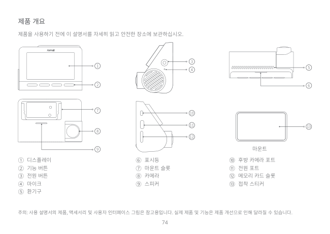 74 제품 개요 주의: 사용 설명서의 제품, 액세서리 및 사용자 인터페이스 그림은 참고용입니다. 실제 제품 및 기능은 제품 개선으로 인해 달라질 수 있습니다. 제품을 사용하기 전에 이 설명서를 자세히 읽고 안전한 장소에 보관하십시오. ① 디스플레이 ② 기능 버튼 ③ 전원 버튼 ④ 마이크 ⑤ 환기구 마운트 ⑥ 표시등 ⑦ 마운트 슬롯 ⑧ 카메라 ⑨ 스피커 ⑩ 후방 카메라 포트 ⑪ 전원 포트 ⑫ 메모리 카드 슬롯 ⑬ 접착 스티커