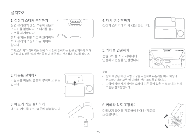 코드를 스캔하여 사용 설명서를 참조하십시오. 패키지 내용물 대시 캠만 구매한 경우 제품 상자에서 다음 항목을 확인하십시오.77 주의사항 대시 캠을 사용하기 전에 올바르고 안전한 사용을 보장하기 위해 모든 주의사항과 온라인 가이드를 읽으십시오.