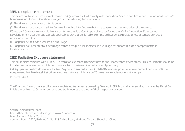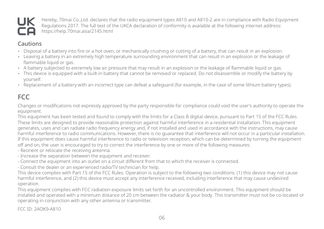 Hereby, 70mai Co.,Ltd. declares that the radio equipment types A810 and A810-2 are in compliance with Radio Equipment Regulations 2017. The full text of the UKCA declaration of conformity is available at the following internet address: https://help.70mai.asia/2145.html07 Service: [email protected] For further information, please go to www.70mai.com Manufacturer: 70mai Co., Ltd. Address: Room 2220, Building 2, No. 588 Zixing Road, Minhang District, Shanghai, China ISED compliance statement This device contains licence-exempt transmitter(s)/receiver(s) that comply with Innovation, Science and Economic Development Canada’s licence-exempt RSS(s). Operation is subject to the following two conditions: (1) This device may not cause interference. (2) This device must accept any interference, including interference that may cause undesired operation of the device. L’émetteur/récepteur exempt de licence contenu dans le présent appareil est conforme aux CNR d’Innovation, Sciences et Développement économique Canada applicables aux appareils radio exempts de licence. L’exploitation est autorisée aux deux conditions suivantes: (1) L’appareil ne doit pas produire de brouillage; (2) L’appareil doit accepter tout brouillage radioélectrique subi, même si le brouillage est susceptible d’en compromettre le fonctionnement. ISED Radiation Exposure statement This equipment complies with IC RSS-102 radiation exposure limits set forth for an uncontrolled environment. This equipment should be installed and operated with minimum distance 20 cm between the radiator and your body. Cet équipement est conforme aux limites d'exposition aux radiations IC CNR-102 établies pour un environnement non contrôlé. Cet équipement doit être installé et utilisé avec une distance minimale de 20 cm entre le radiateur et votre corps.