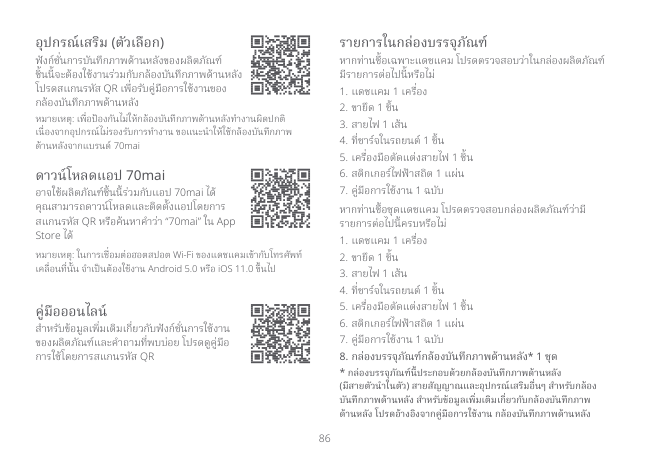 86 ดาวน์โหลดแอป 70mai อาจใช้ผลิตภัณฑ์ชิ้นนี้ร่วมกับแอป 70mai ได้ คุณสามารถดาวน์โหลดและติดตั้งแอปโดยการ สแกนรหัส QR หรือค้นหาคำ�ว่า “70mai” ใน App Store ได้ หมายเหตุ: ในการเชื่อมต่อฮอตสปอต Wi-Fi ของแดชแคมเข้ากับโทรศัพท์ เคลื่อนที่นั้น จำ�เป็นต้องใช้งาน Android 5.0 หรือ iOS 11.0 ขึ้นไป อุปกรณ์เสริม (ตัวเลือก) ฟังก์ชั่นการบันทึกภาพด้านหลังของผลิตภัณฑ์ ชิ้นนี้จะต้องใช้งานร่วมกับกล้องบันทึกภาพด้านหลัง