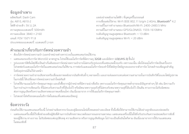 Dung lượng pin: 500mAh Độ phân giải: 3840×2160 Ống kính: FOV 150°/ F1.8 Loại pin: Pin Li-ion Hướng dẫn về thẻ nhớ83 thông tin nào do vận hành camera hành trình trong khi lái xe.