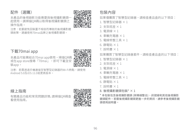 96 下載70mai app 本產品可能需結合70mai app使用。掃描QR碼 或在app store搜尋「70mai」,即可下載並安 裝app。 注意:若需透過手機連接至智慧型記錄器的Wi-Fi熱點,請使用 Android 5.0及iOS 11.0或更高版本。 配件(選購) 本產品的後視錄影功能需要與後視攝影鏡頭一