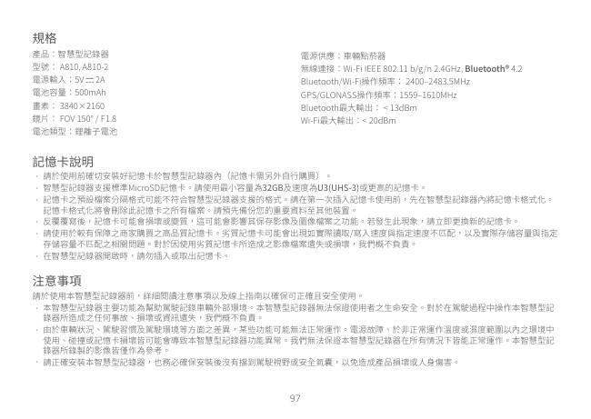 The A810 Series Dash Cam records at a resolution of 3840 × 2160 (4K). The lens has a field of view of 150° and an aperture of F1.8. (Page 4)