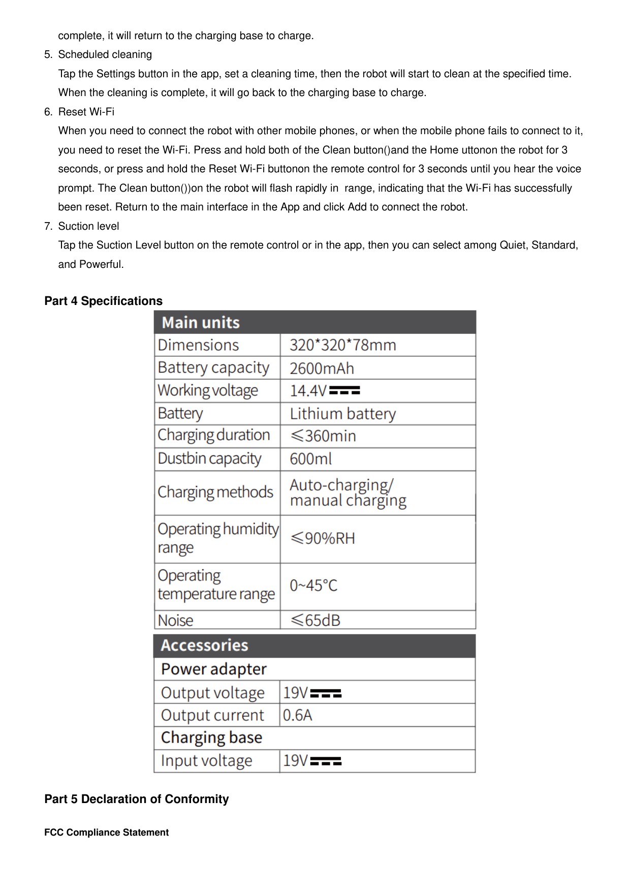 Only authorized technicians are allowed to dismantle the robot. Users must not dismantle or repair it. Please use the original adapter provided by the manufacturer only. Incompatible adapters may cause electric shock, fire, or damage to the robot. Do not touch the plug or the adapter with wet hands. Please clear the floor before using the robot by removing all fragile and lightweight items, such as cables, clothes, tissues and curtains, as they might get tangled in it. Do not use the robot to pick up cigarettes, lighters, matches or other flammable materials. Do not use force to bend the power cable and do not let it bear with pressure from heavy or sharp objects. Do not use the robot outdoors. It is only for using indoors. Do not sit on the robot or place any objects on top of it. Do not use the robot in a wet or damp environment. Only use the robot in the temperature range between 0°C and 45°C (degrees Celsius). Do not use the robot in a suspended environment. Ifyou must use it in a suspended environment, prevent it from accidentally talling with firm protective fences, as it may cause personal injury or property damage. Turn off the power if the robot left unused for an extended period. Inform everyone at home or in the office when the robot is working in the same place so that no one trips over it Disconnect the robot from the power supply before removing the battery. This appliance can be used by children aged from 8 years and above and persons with reduced physical, sensory or mental capabilities or lack of experience and knowledge if they have been given supervision or instruction concening use of the appliance in a sate way and understand the hazards involved. Children shall not play with the appliance. Cleaning and user maintenance shall not be made by children without supervision. Children should be supervised to ensure that they do not play with the appliance. To maintain the robot and charging base, please turn off the robot ftirst, unplug it from the socket, and disconnect the power supply. Battery and Charging It is forbidden to incinerate the product. Even if it is severely damaged, the battery may explode. Do not use any third-party batteries, or charging bases. Do not dismantle, repair, or modify the battery and charging base. Do not place the charging base near a heat source, such as heater Do not wipe or clean the charging base with wet cloth or wet hands. Do not throw away old batteries. The disposal of old batteries should be handled by a professional recycling agency. If the power cord is damaged, it must be replaced by a professional technician authorized by the manufacturer, for personal safety. Please make sure the robot is turned off and it’s recommended to use the original packaging during transportation. If unused for an extended period, please turn the robot off after having fully charged it and store it in a cool and dry place. Charge the robot at least once every three months to avoid damage to the battery due to excessive discharge Use the right tool to take out the battery when needed. The power supply must be disconnected when