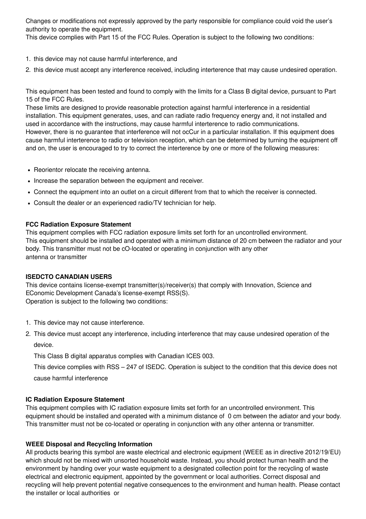 Changes or modifications not expressly approved by the party responsible for compliance could void the user’s authority to operate the equipment. This device complies with Part 15 of the FCC Rules. Operation is subject to the following two conditions: