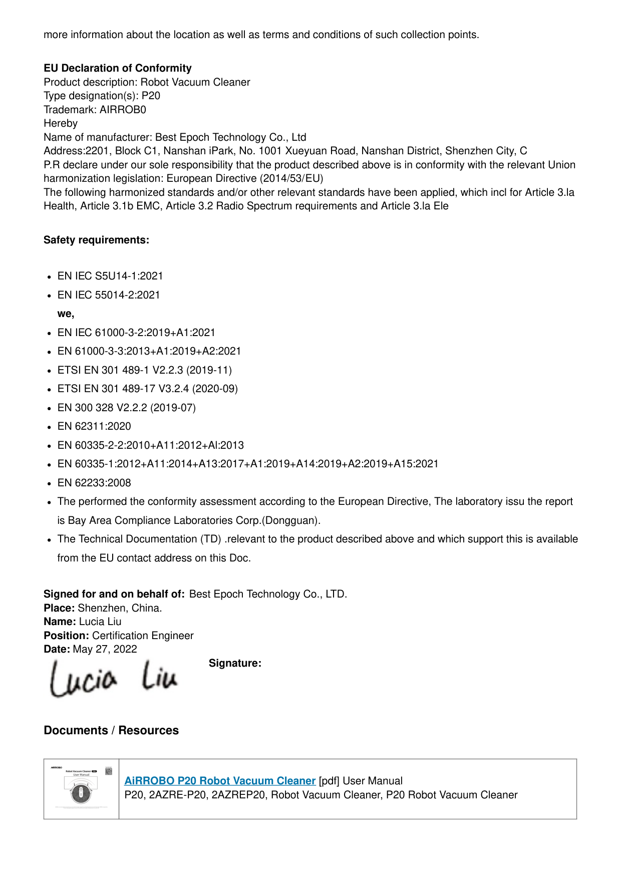 The performed the conformity assessment according to the European Directive, The laboratory issu the report is Bay Area Compliance Laboratories Corp.(Dongguan). The Technical Documentation (TD) .relevant to the product described above and which support this is available from the EU contact address on this Doc. Signed for and on behalf of: Best Epoch Technology Co., LTD. Place: Shenzhen, China. Name: Lucia Liu Position: Certification Engineer Date: May 27, 2022 Signature:Documents / Resources AiRROBO P20 Robot Vacuum Cleaner [pdf] User Manual P20, 2AZRE-P20, 2AZREP20, Robot Vacuum Cleaner, P20 Robot Vacuum Cleaner