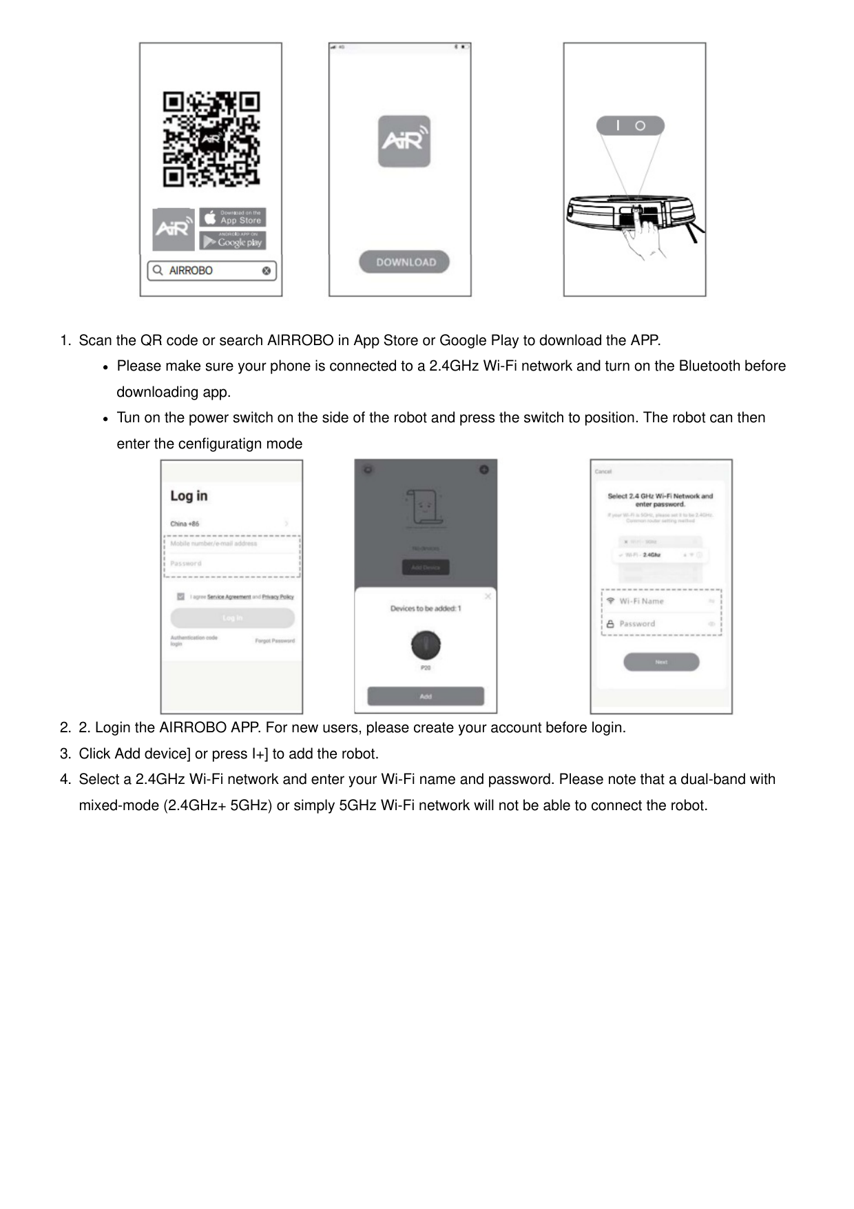 The P20 only supports 2.4GHz Wi-Fi networks and cannot connect to 5GHz or dual-band mixed-mode (2.4GHz + 5GHz) networks. Make sure both your robot and mobile phone are within the effective coverage area of the same 2.4GHz Wi-Fi router. Also ensure Bluetooth is turned on your phone before attempting to connect via the AIRROBO app. (Page 7-8)