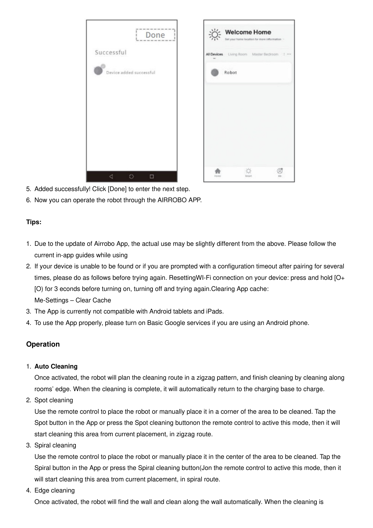 Tap the Settings button in the AIRROBO app and set your desired cleaning time. The robot will automatically start cleaning at the specified time. When cleaning is complete, it will return to the charging base to charge. (Page 10)