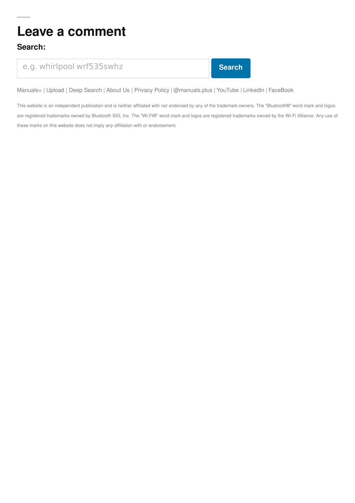 Search Manuals+ | Upload | Deep Search | About Us | Privacy Policy | @manuals.plus | YouTube | LinkedIn | FaceBook This website is an independent publication and is neither affiliated with nor endorsed by any of the trademark owners. The "Bluetooth®" word mark and logos are registered trademarks owned by Bluetooth SIG, Inc. The "Wi-Fi®" word mark and logos are registered trademarks owned by the Wi-Fi Alliance. Any use of these marks on this website does not imply any affiliation with or endorsement.