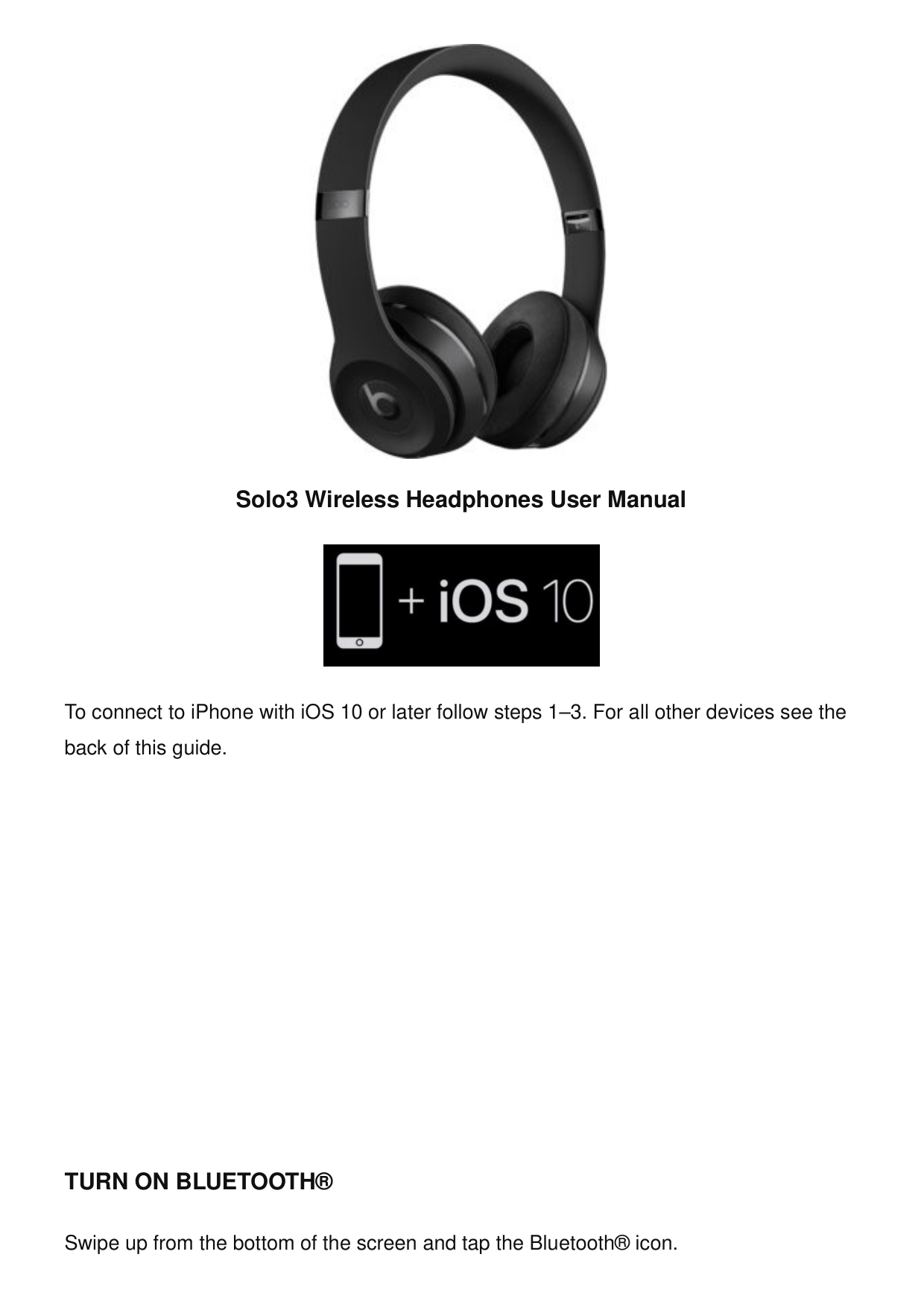 12 Read More About This Manual & Download PDF: 13 Questions about your Manual? Post in the comments! 14 References 15 Related Posts Solo3 Wireless Headphones User Manual Manuals+Solo3 Wireless Headphones User Manual To connect to iPhone with iOS 10 or later follow steps 1–3. For all other devices see the back of this guide.