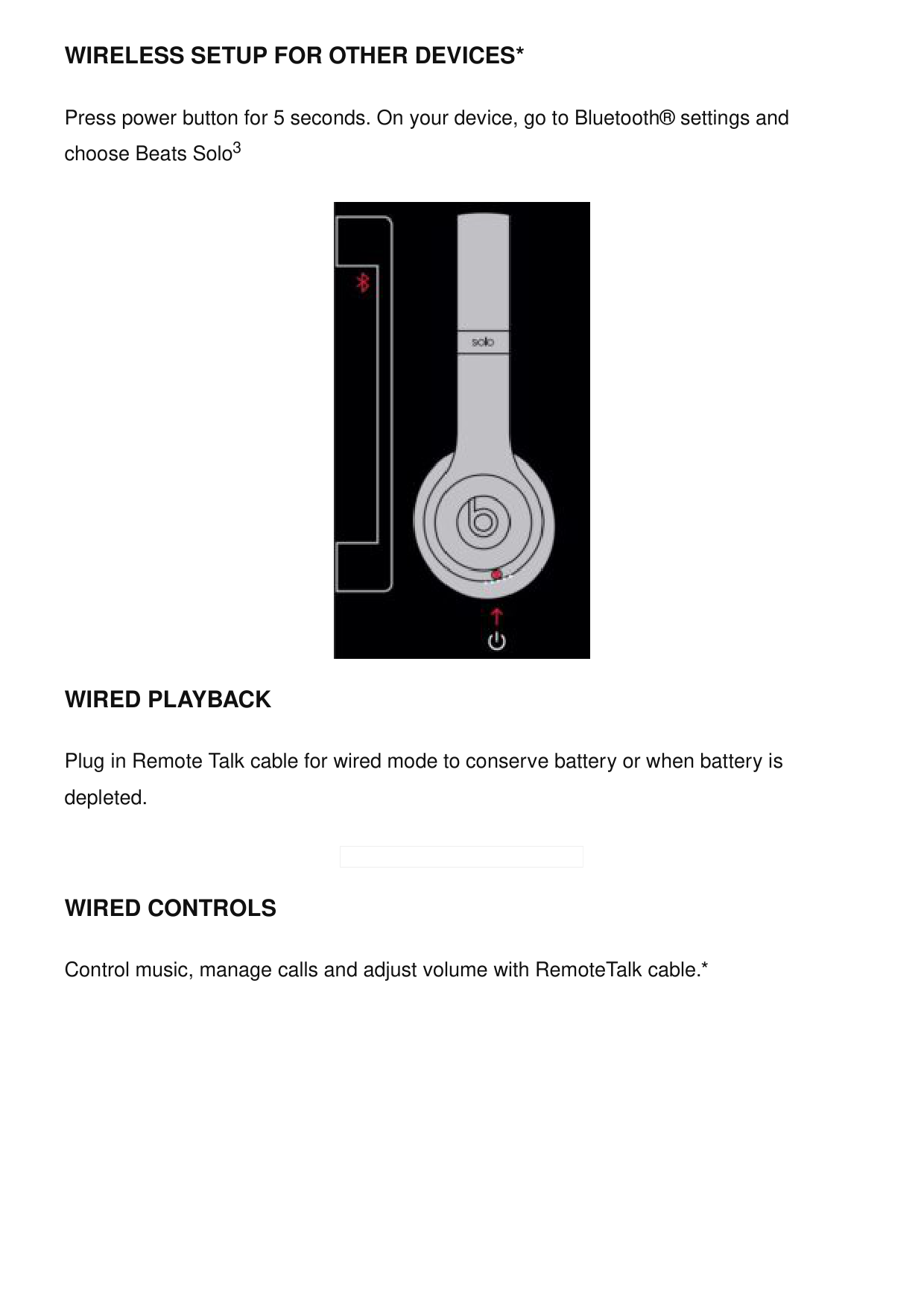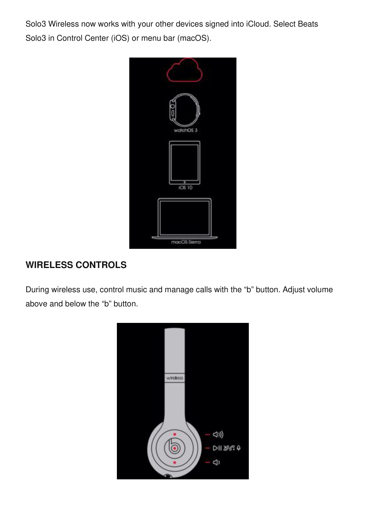 During wireless use, control music and manage calls with the “b” button. Adjust volume above and below the “b” button.Wireless Setup For Other Devices*