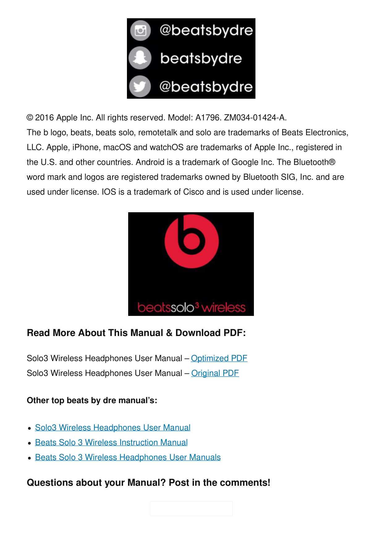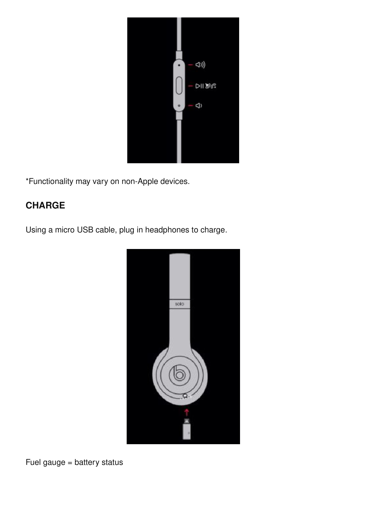 Using a micro USB cable, plug in headphones to charge. Fuel gauge = battery status© 2016 Apple Inc. All rights reserved. Model: A1796. ZM034-01424-A. The b logo, beats, beats solo, remotetalk and solo are trademarks of Beats Electronics, LLC. Apple, iPhone, macOS and watchOS are trademarks of Apple Inc., registered in the U.S. and other countries. Android is a trademark of Google Inc. The Bluetooth® word mark and logos are registered trademarks owned by Bluetooth SIG, Inc. and are used under license. IOS is a trademark of Cisco and is used under license. Read More About This Manual & Download PDF: Solo3 Wireless Headphones User Manual – Optimized PDF Solo3 Wireless Headphones User Manual – Original PDF Other top beats by dre manual’s: Solo3 Wireless Headphones User Manual Beats Solo 3 Wireless Instruction Manual Beats Solo 3 Wireless Headphones User Manuals Questions about your Manual? Post in the comments!