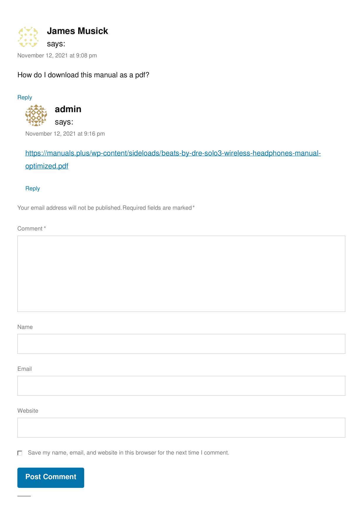 How do I download this manual as a pdf? Reply says: November 12, 2021 at 9:08 pm James Musick https://manuals.plus/wp-content/sideloads/beats-by-dre-solo3-wireless-headphones-manual- optimized.pdf Reply says: November 12, 2021 at 9:16 pm admin Your email address will not be published. Required fields are marked * Comment * Name Email Website Save my name, email, and website in this browser for the next time I comment. Post Comment