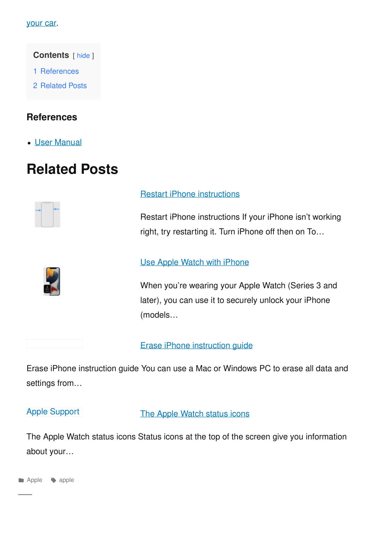 Restart iPhone instructions Restart iPhone instructions If your iPhone isn’t working right, try restarting it. Turn iPhone off then on To… Use Apple Watch with iPhone When you’re wearing your Apple Watch (Series 3 and later), you can use it to securely unlock your iPhone (models… Erase iPhone instruction guide Erase iPhone instruction guide You can use a Mac or Windows PC to erase all data and settings from… The Apple Watch status icons The Apple Watch status icons Status icons at the top of the screen give you information about your… your car. Contents [ hide ] 1 References 2 Related Posts References User Manual Related Posts Apple apple Apple Support
