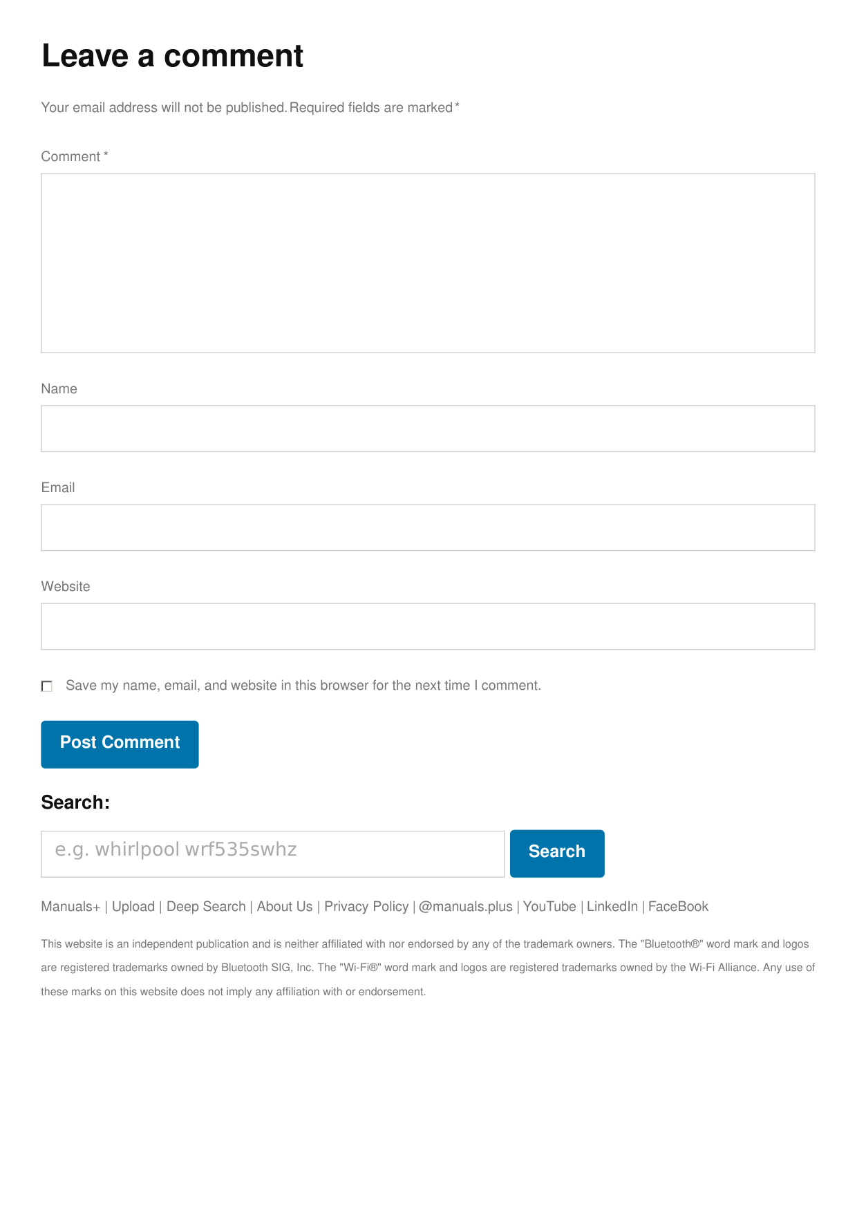 Search Manuals+ | Upload | Deep Search | About Us | Privacy Policy | @manuals.plus | YouTube | LinkedIn | FaceBook This website is an independent publication and is neither affiliated with nor endorsed by any of the trademark owners. The "Bluetooth®" word mark and logos are registered trademarks owned by Bluetooth SIG, Inc. The "Wi-Fi®" word mark and logos are registered trademarks owned by the Wi-Fi Alliance. Any use of these marks on this website does not imply any affiliation with or endorsement. Your email address will not be published. Required fields are marked * Comment * Name Email Website Save my name, email, and website in this browser for the next time I comment. Post Comment
