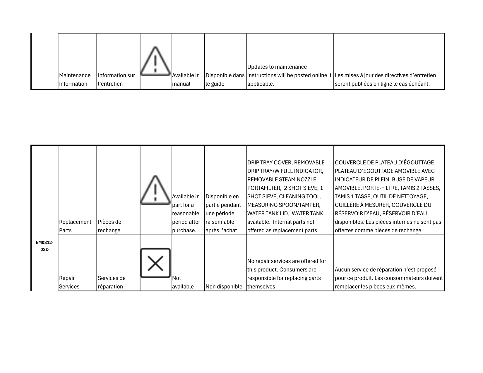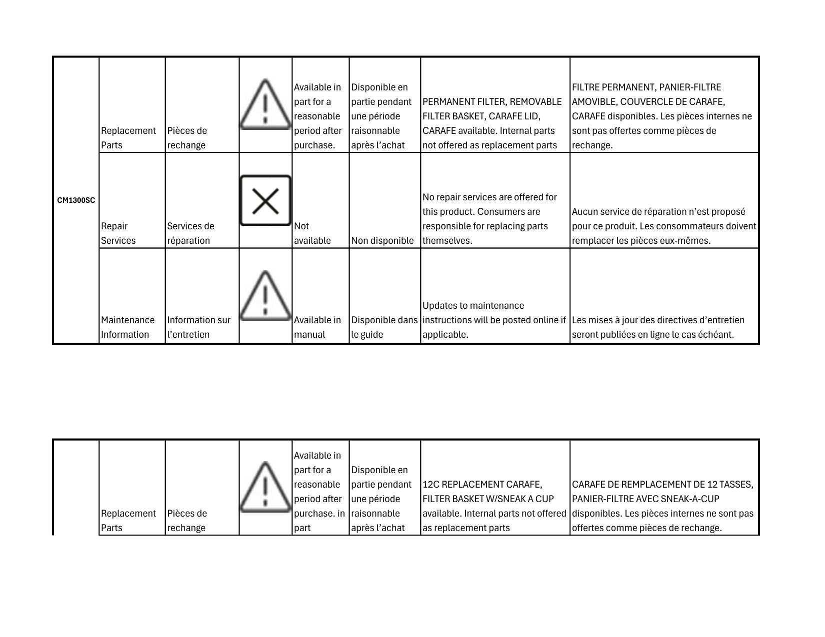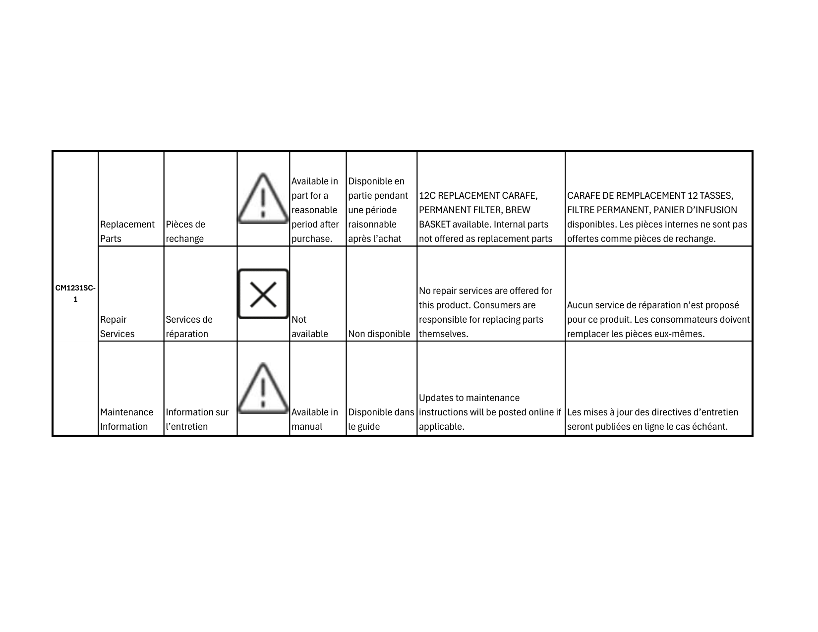 CARAFE disponibles. Les pièces internes ne sont pas offertes comme pièces de rechange. Repair Services Services de réparation Not available Non disponible No repair services are offered for this product. Consumers are responsible for replacing parts themselves. Aucun service de réparation n’est proposé pour ce produit. Les consommateurs doivent remplacer les pièces eux-mêmes. Maintenance Information Information sur l’entretien Available in manual Disponible dans le guide Updates to maintenance instructions will be posted online if applicable. Les mises à jour des directives d’entretien seront publiées en ligne le cas échéant. Replacement Parts Pièces de rechange Available in part for a reasonable period after purchase. in part Disponible en partie pendant une période raisonnable après l’achat12C Replacement Carafe,