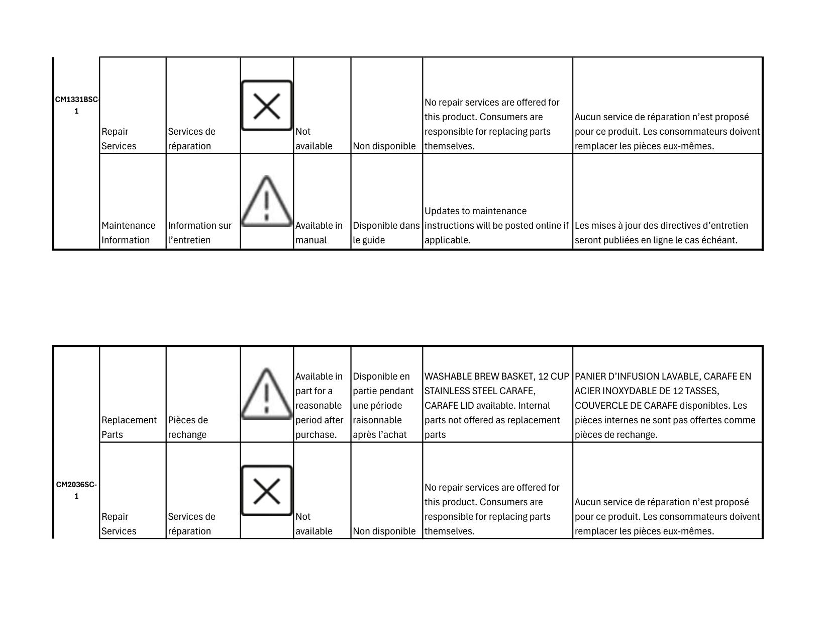 COUVERCLE DE CARAFE disponibles. Les pièces internes ne sont pas offertes comme pièces de rechange. Repair Services Services de réparation Not available Non disponible No repair services are offered for this product. Consumers are responsible for replacing parts themselves. Aucun service de réparation n’est proposé pour ce produit. Les consommateurs doivent remplacer les pièces eux-mêmes.Cm1331Bsc-