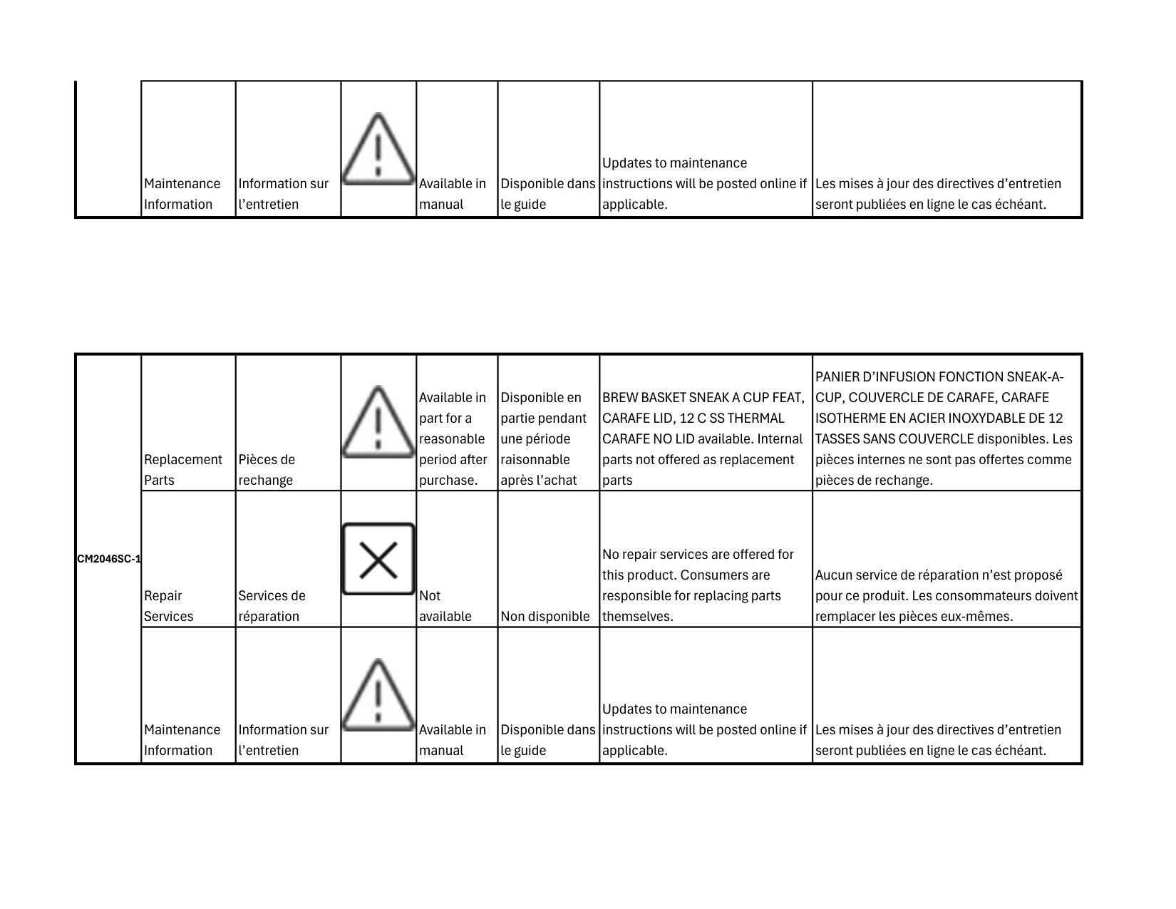 TASSES SANS COUVERCLE disponibles. Les pièces internes ne sont pas offertes comme pièces de rechange. Repair Services Services de réparation Not available Non disponible No repair services are offered for this product. Consumers are responsible for replacing parts themselves. Aucun service de réparation n’est proposé pour ce produit. Les consommateurs doivent remplacer les pièces eux-mêmes. Maintenance Information Information sur l’entretien Available in manual Disponible dans le guide Updates to maintenance instructions will be posted online if applicable. Les mises à jour des directives d’entretien seront publiées en ligne le cas échéant.Cm2046Sc-1