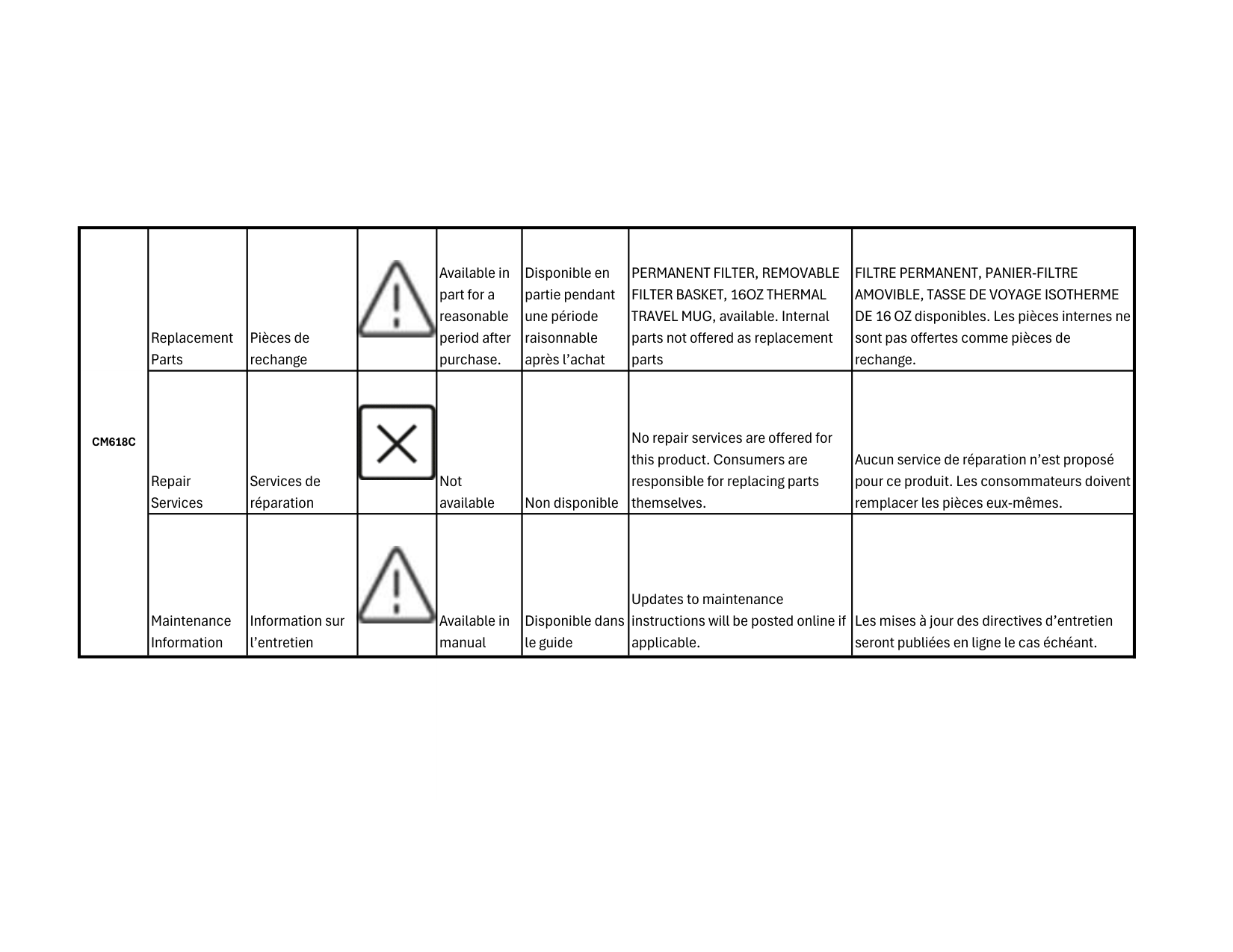 DE 16 OZ disponibles. Les pièces internes ne sont pas offertes comme pièces de rechange. Repair Services Services de réparation Not available Non disponible No repair services are offered for this product. Consumers are responsible for replacing parts themselves. Aucun service de réparation n’est proposé pour ce produit. Les consommateurs doivent remplacer les pièces eux-mêmes. Maintenance Information Information sur l’entretien Available in manual Disponible dans le guide Updates to maintenance instructions will be posted online if applicable. Les mises à jour des directives d’entretien seront publiées en ligne le cas échéant.Cm618C