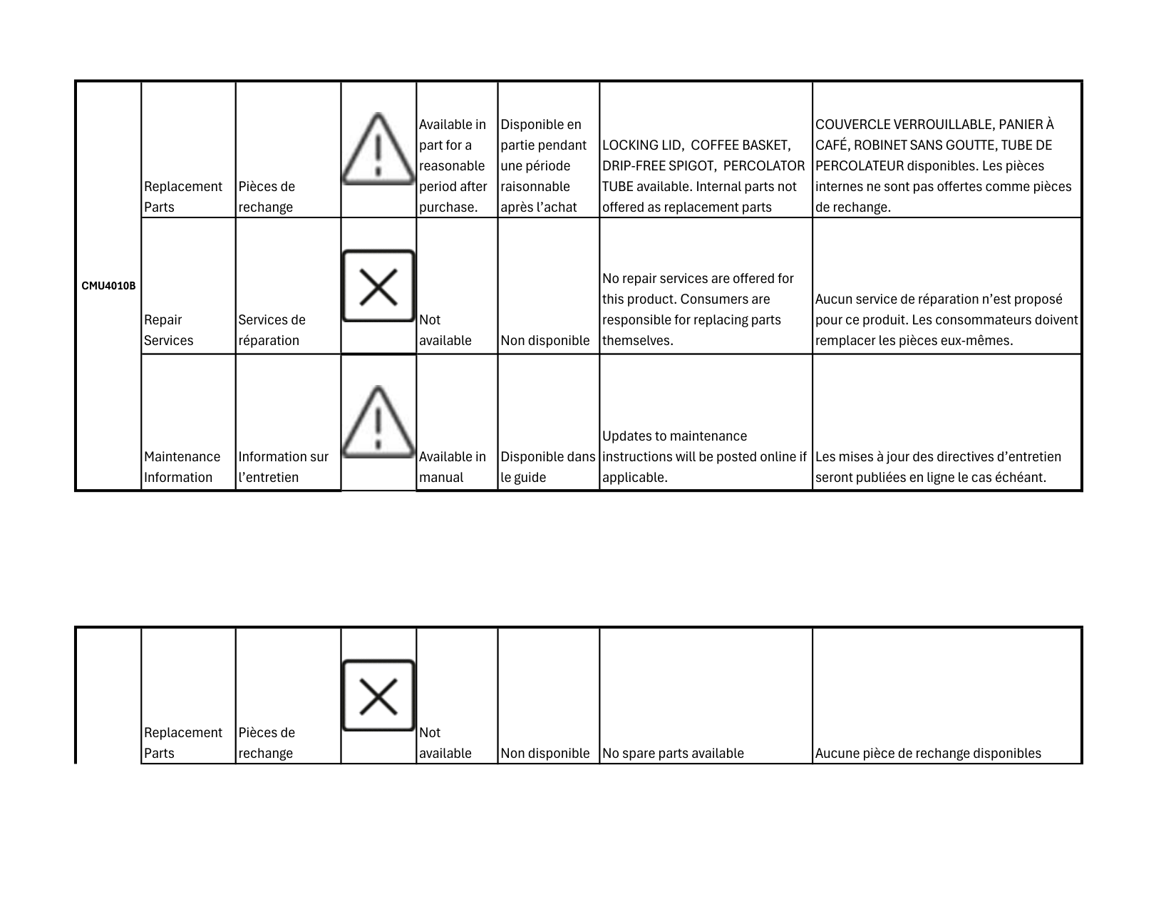 PERCOLATEUR disponibles. Les pièces internes ne sont pas offertes comme pièces de rechange. Repair Services Services de réparation Not available Non disponible No repair services are offered for this product. Consumers are responsible for replacing parts themselves. Aucun service de réparation n’est proposé pour ce produit. Les consommateurs doivent remplacer les pièces eux-mêmes. Maintenance Information Information sur l’entretien Available in manual Disponible dans le guide Updates to maintenance instructions will be posted online if applicable. Les mises à jour des directives d’entretien seront publiées en ligne le cas échéant. Replacement Parts Pièces de rechange Not available Non disponible No spare parts available Aucune pièce de rechange disponiblesCmu4010B