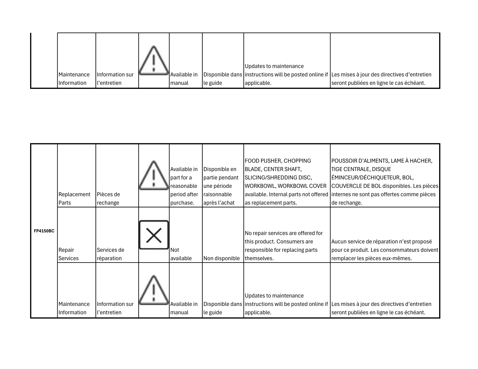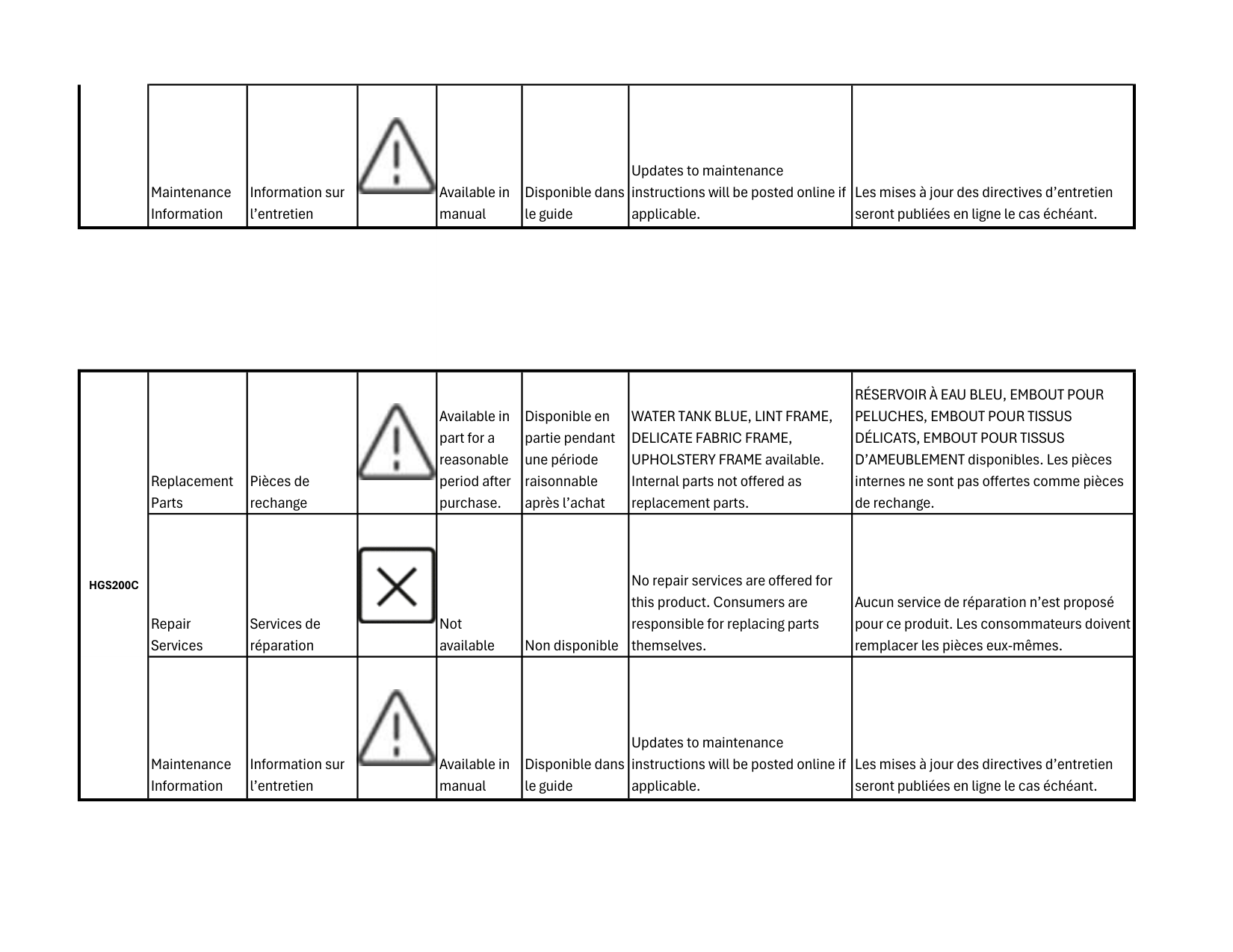 1Maintenance Information Information sur l’entretien Available in manual Disponible dans le guide Updates to maintenance instructions will be posted online if applicable. Les mises à jour des directives d’entretien seront publiées en ligne le cas échéant. Replacement Parts Pièces de rechange Available in part for a reasonable period after purchase. Disponible en partie pendant une période raisonnable après l’achat