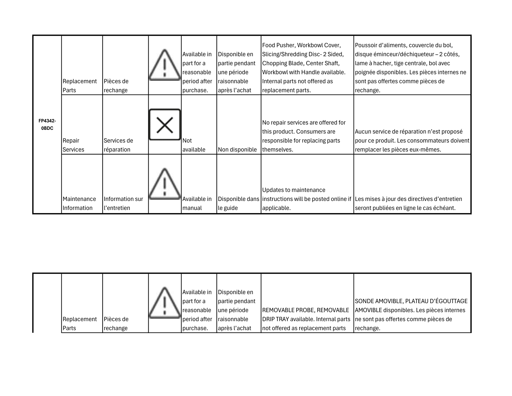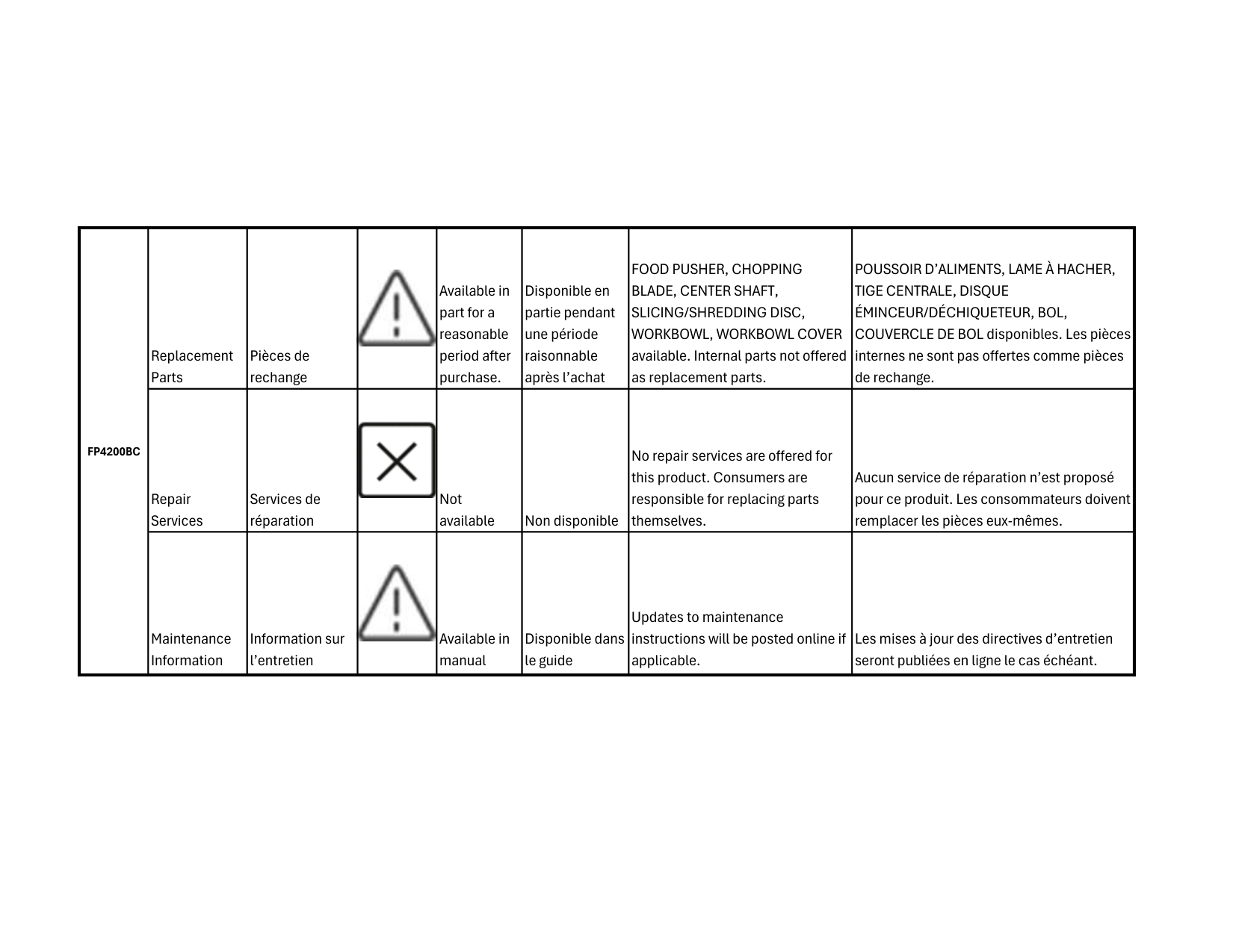 FRITURE 6 PTE AVEC POIGNÉE disponibles. Les pièces internes ne sont pas offertes comme pièces de rechange. Repair Services Services de réparation Not available Non disponible No repair services are offered for this product. Consumers are responsible for replacing parts themselves. Aucun service de réparation n’est proposé pour ce produit. Les consommateurs doivent remplacer les pièces eux-mêmes. Maintenance Information Information sur l’entretien Available in manual Disponible dans le guide Updates to maintenance instructions will be posted online if applicable. Les mises à jour des directives d’entretien seront publiées en ligne le cas échéant. Disclosure of Availability of Replacement Parts, Repair Services and Maintenance Information Divulgation de la disponibilité des pièces de rechange, des services de réparation et des informations de maintenanceAfbd62-