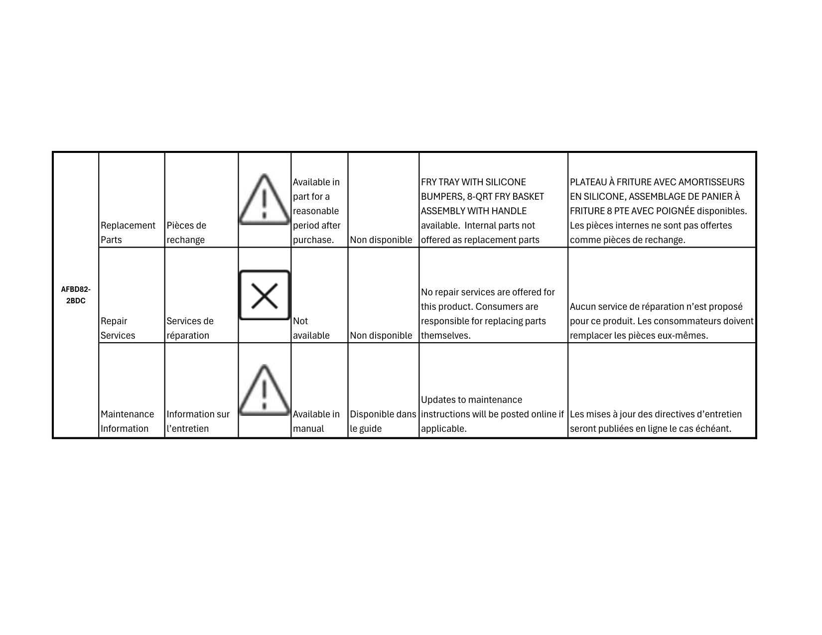 FRITURE 8 PTE AVEC POIGNÉE disponibles. Les pièces internes ne sont pas offertes comme pièces de rechange. Repair Services Services de réparation Not available Non disponible No repair services are offered for this product. Consumers are responsible for replacing parts themselves. Aucun service de réparation n’est proposé pour ce produit. Les consommateurs doivent remplacer les pièces eux-mêmes. Maintenance Information Information sur l’entretien Available in manual Disponible dans le guide Updates to maintenance instructions will be posted online if applicable. Les mises à jour des directives d’entretien seront publiées en ligne le cas échéant.Afbd82-