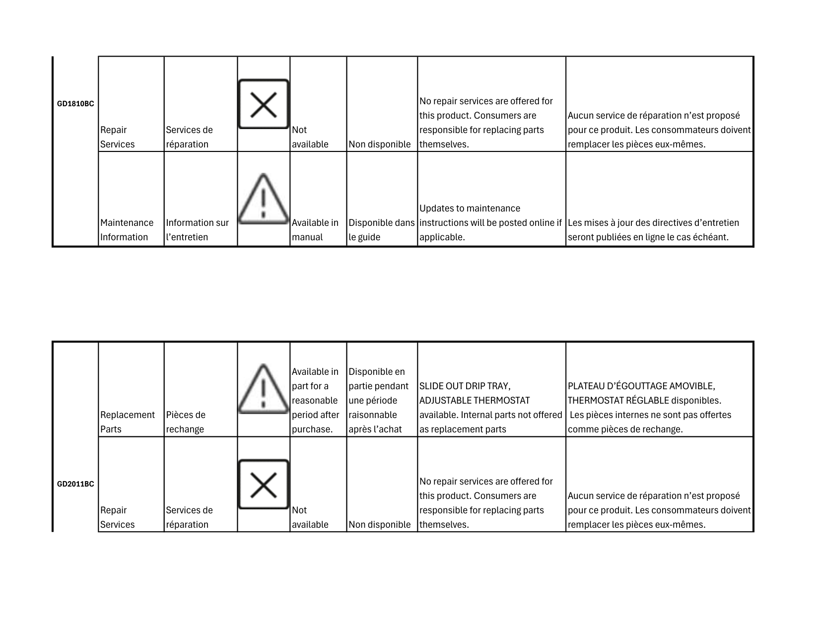 Replacement Parts Pièces de rechange Available in part for a reasonable period after purchase. Disponible en partie pendant une période raisonnable après l’achat Baking Pan, Wire Rack, Drip Tray, Crisper Tray available. Internal parts not offered as replacement parts Plaque de cuisson, grille, plateau d’égouttage, plateau à friture disponibles. Les pièces internes ne sont pas offertes comme pièces de rechange. Repair Services Services de réparation Not available Non disponible No repair services are offered for this product. Consumers are responsible for replacing parts themselves. Aucun service de réparation n’est proposé pour ce produit. Les consommateurs doivent remplacer les pièces eux-mêmes. Maintenance Information Information sur l’entretien Available in manual Disponible dans le guide Updates to maintenance instructions will be posted online if applicable. Les mises à jour des directives d’entretien seront publiées en ligne le cas échéant. Replacement Parts Pièces de rechange Available in part for a reasonable period after purchase. Disponible en partie pendant une période raisonnable après l’achat slide out crumb tray available. Internal parts not offered as replacement parts. plateau à miettes coulissant disponible. Les pièces internes ne sont pas offertes comme pièces de rechange.