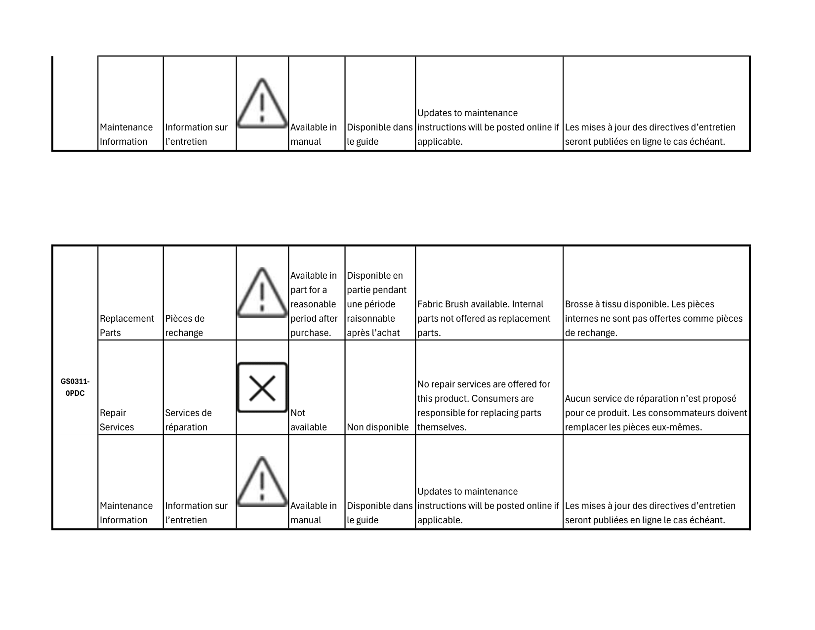 Maintenance Information Information sur l’entretien Available in manual Disponible dans le guide Updates to maintenance instructions will be posted online if applicable. Les mises à jour des directives d’entretien seront publiées en ligne le cas échéant. Replacement Parts Pièces de rechange Available in part for a reasonable period after purchase. Disponible en partie pendant une période raisonnable après l’achat