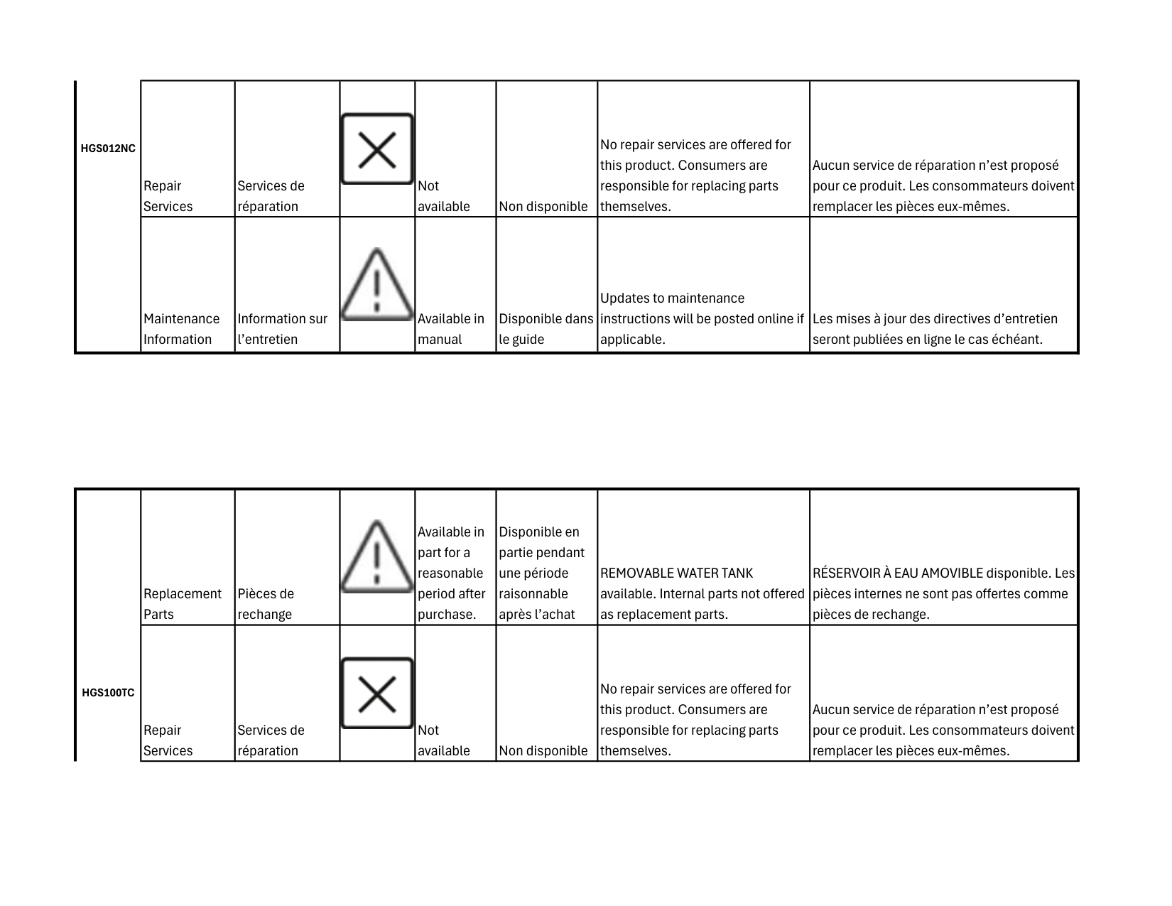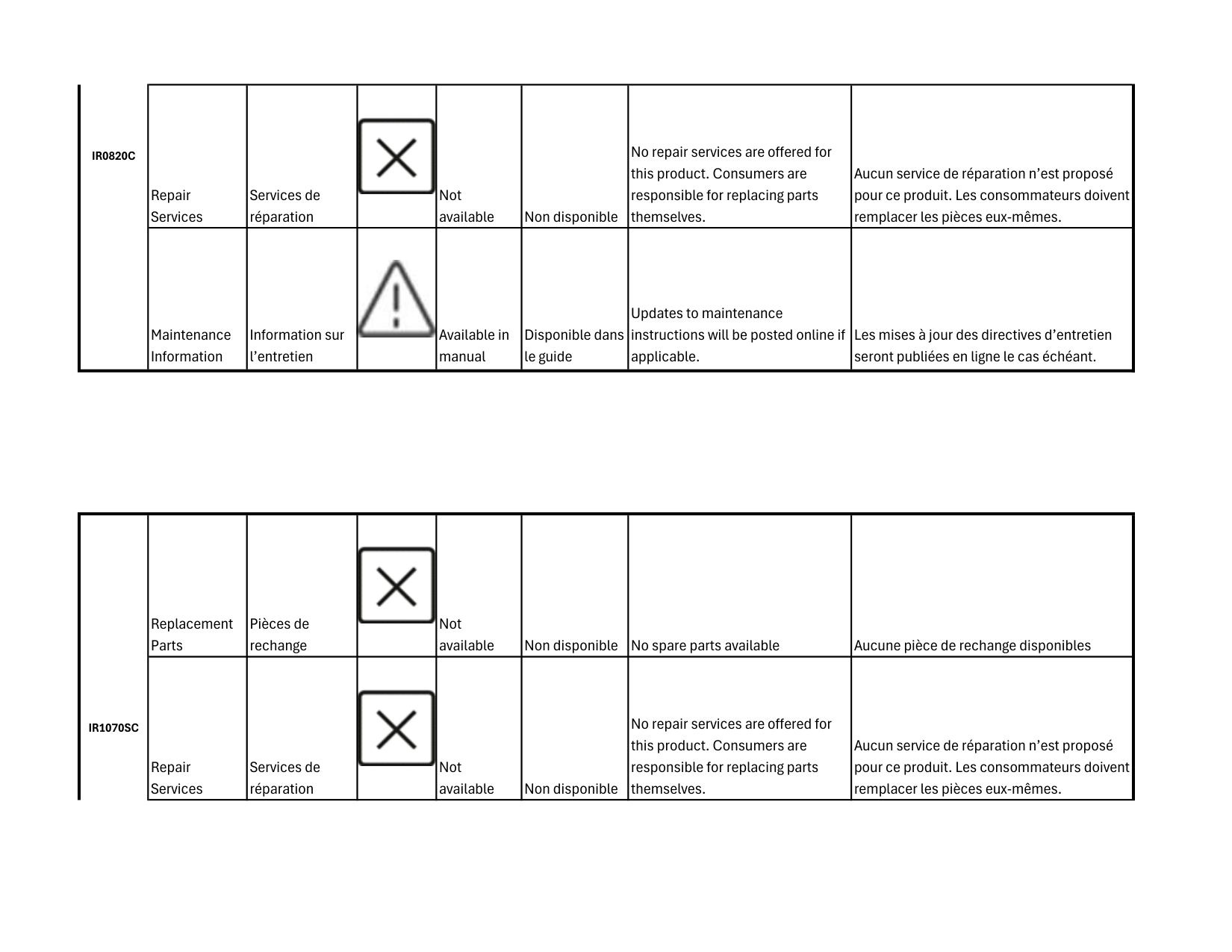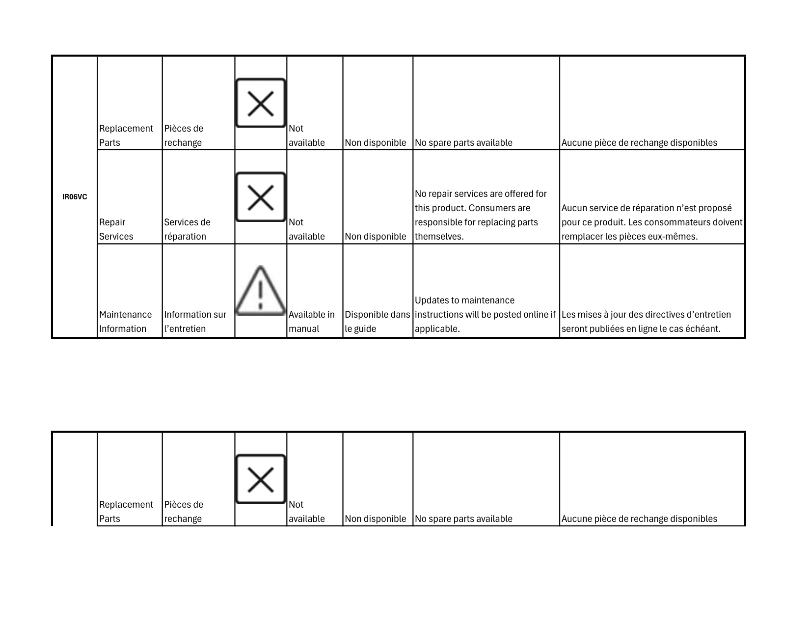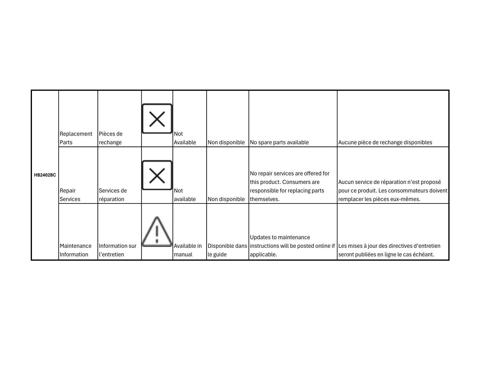 Repair Services Services de réparation Not available Non disponible No repair services are offered for this product. Consumers are responsible for replacing parts themselves. Aucun service de réparation n’est proposé pour ce produit. Les consommateurs doivent remplacer les pièces eux-mêmes. Maintenance Information Information sur l’entretien Available in manual Disponible dans le guide Updates to maintenance instructions will be posted online if applicable. Les mises à jour des directives d’entretien seront publiées en ligne le cas échéant. Replacement Parts Pièces de rechange Not available Non disponible No spare parts available Aucune pièce de rechange disponibles Repair Services Services de réparation Not available Non disponible No repair services are offered for this product. Consumers are responsible for replacing parts themselves. Aucun service de réparation n’est proposé pour ce produit. Les consommateurs doivent remplacer les pièces eux-mêmes.