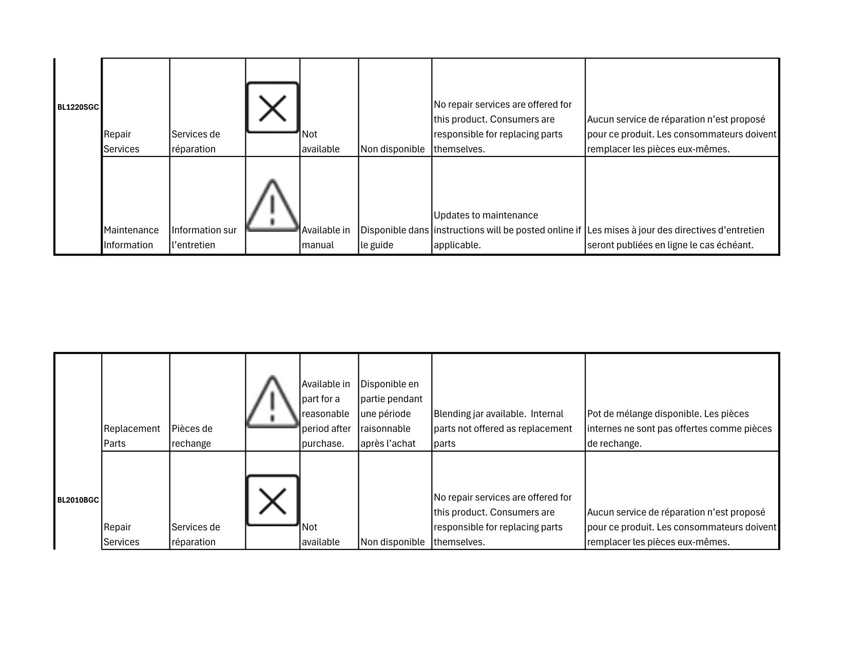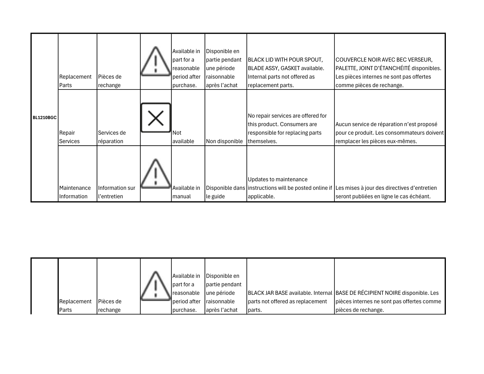 PALETTE, JOINT D’ÉTANCHÉITÉ disponibles. Les pièces internes ne sont pas offertes comme pièces de rechange. Repair Services Services de réparation Not available Non disponible No repair services are offered for this product. Consumers are responsible for replacing parts themselves. Aucun service de réparation n’est proposé pour ce produit. Les consommateurs doivent remplacer les pièces eux-mêmes. Maintenance Information Information sur l’entretien Available in manual Disponible dans le guide Updates to maintenance instructions will be posted online if applicable. Les mises à jour des directives d’entretien seront publiées en ligne le cas échéant. Replacement Parts Pièces de rechange Available in part for a reasonable period after purchase. Disponible en partie pendant une période raisonnable après l’achat BLACK JAR BASE available. Internal parts not offered as replacement parts. BASE DE RÉCIPIENT NOIRE disponible. Les pièces internes ne sont pas offertes comme pièces de rechange.Bl1210Bgc