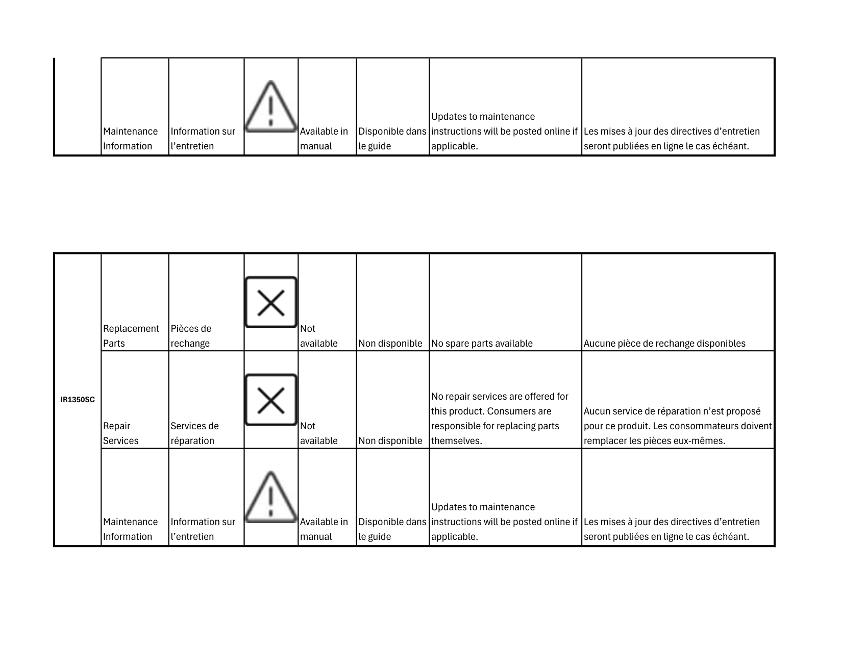 Maintenance Information Information sur l’entretien Available in manual Disponible dans le guide Updates to maintenance instructions will be posted online if applicable. Les mises à jour des directives d’entretien seront publiées en ligne le cas échéant. Replacement Parts Pièces de rechange Not available Non disponible No spare parts available Aucune pièce de rechange disponibles Repair Services Services de réparation Not available Non disponible No repair services are offered for this product. Consumers are responsible for replacing parts themselves. Aucun service de réparation n’est proposé pour ce produit. Les consommateurs doivent remplacer les pièces eux-mêmes. Maintenance Information Information sur l’entretien Available in manual Disponible dans le guide Updates to maintenance instructions will be posted online if applicable. Les mises à jour des directives d’entretien seront publiées en ligne le cas échéant.