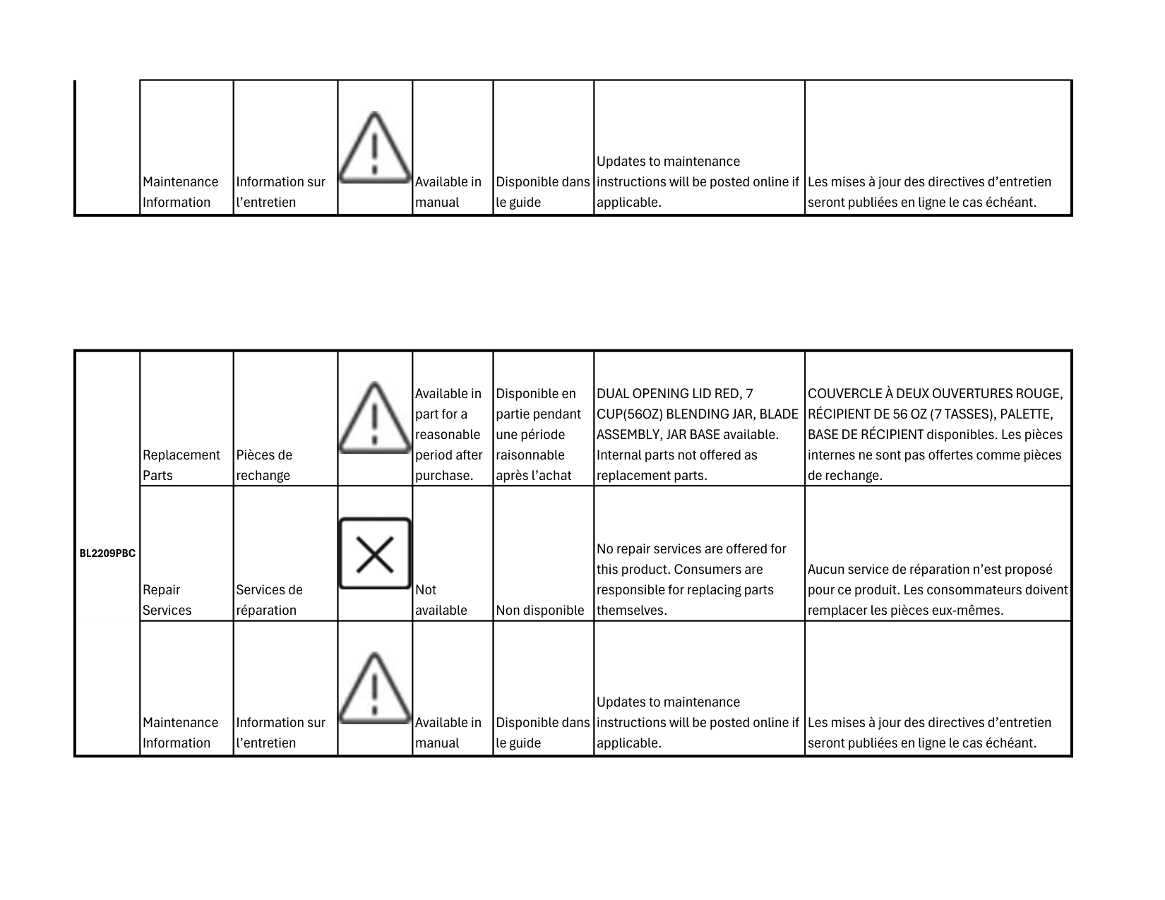 BASE DE RÉCIPIENT disponibles. Les pièces internes ne sont pas offertes comme pièces de rechange. Repair Services Services de réparation Not available Non disponible No repair services are offered for this product. Consumers are responsible for replacing parts themselves. Aucun service de réparation n’est proposé pour ce produit. Les consommateurs doivent remplacer les pièces eux-mêmes. Maintenance Information Information sur l’entretien Available in manual Disponible dans le guide Updates to maintenance instructions will be posted online if applicable. Les mises à jour des directives d’entretien seront publiées en ligne le cas échéant.Bl2209Pbc