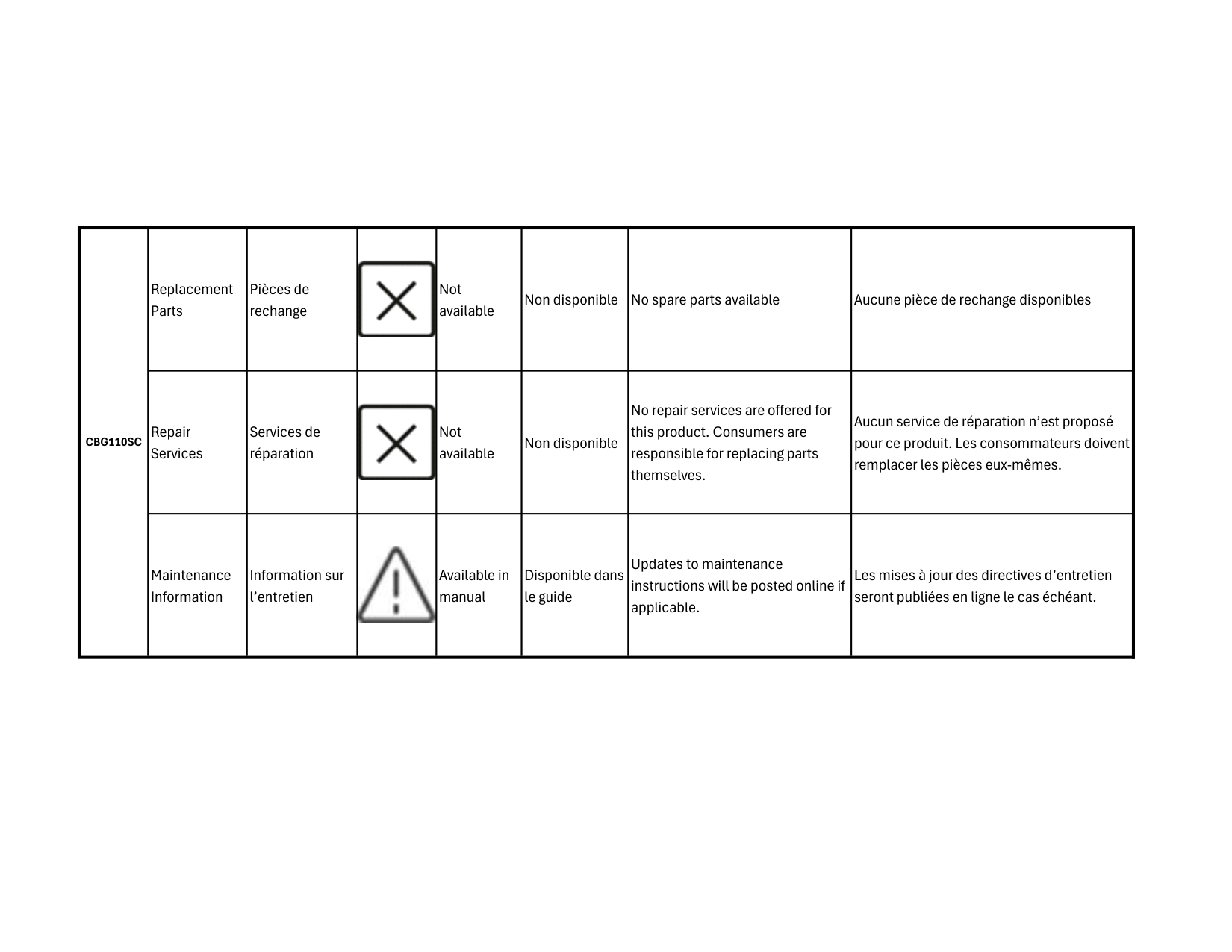 disponibles. Les pièces internes ne sont pas offertes comme pièces de rechange. Repair Services Services de réparation Not available Non disponible No repair services are offered for this product. Consumers are responsible for replacing parts themselves. Aucun service de réparation n’est proposé pour ce produit. Les consommateurs doivent remplacer les pièces eux-mêmes. Maintenance Information Information sur l’entretien Available in manual Disponible dans le guide Updates to maintenance instructions will be posted online if applicable. Les mises à jour des directives d’entretien seront publiées en ligne le cas échéant.Cm1110Bc-