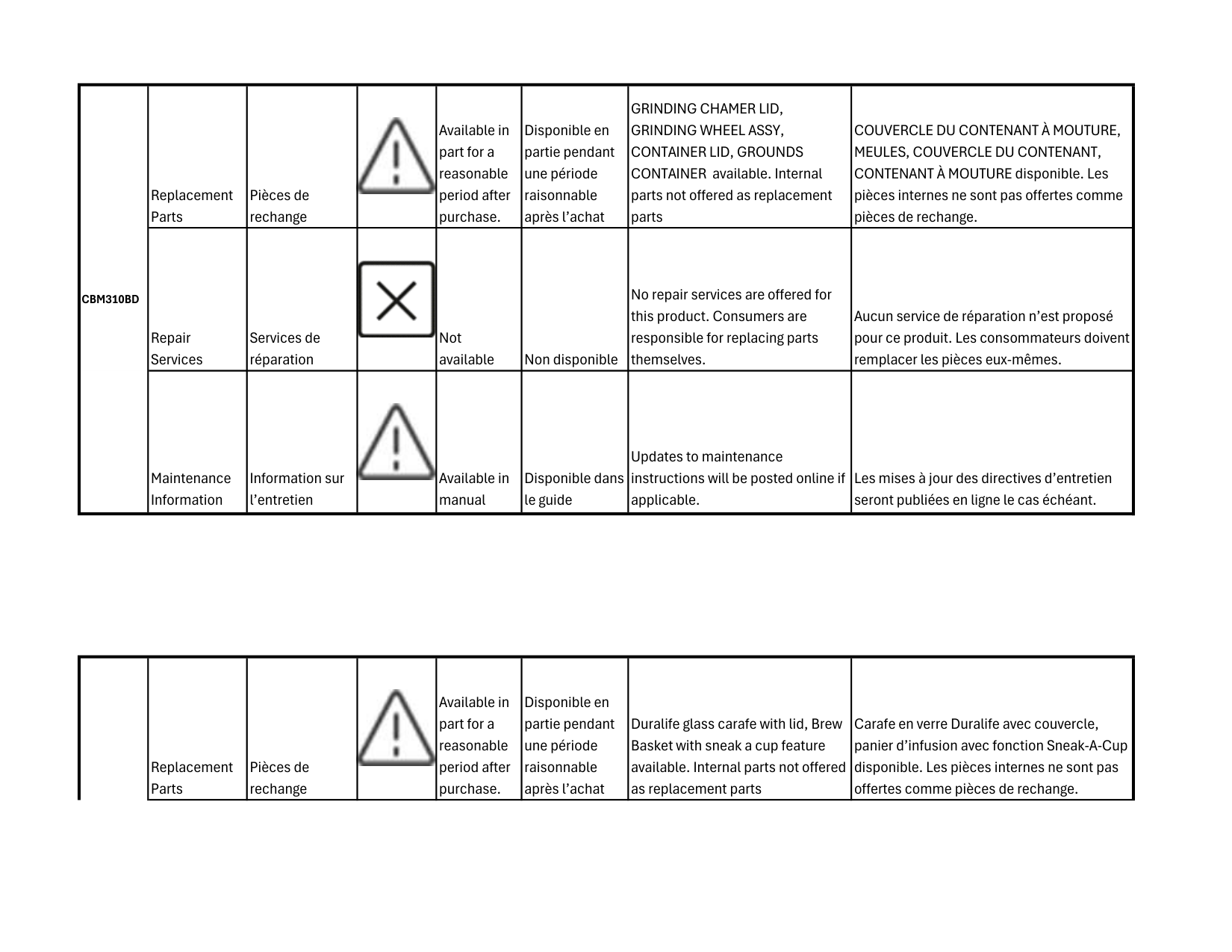 CONTENANT À MOUTURE disponible. Les pièces internes ne sont pas offertes comme pièces de rechange. Repair Services Services de réparation Not available Non disponible No repair services are offered for this product. Consumers are responsible for replacing parts themselves. Aucun service de réparation n’est proposé pour ce produit. Les consommateurs doivent remplacer les pièces eux-mêmes. Maintenance Information Information sur l’entretien Available in manual Disponible dans le guide Updates to maintenance instructions will be posted online if applicable. Les mises à jour des directives d’entretien seront publiées en ligne le cas échéant. Replacement Parts Pièces de rechange Available in part for a reasonable period after purchase. Disponible en partie pendant une période raisonnable après l’achat Duralife glass carafe with lid, Brew Basket with sneak a cup feature available. Internal parts not offered as replacement parts Carafe en verre Duralife avec couvercle, panier d’infusion avec fonction Sneak-A-Cup disponible. Les pièces internes ne sont pas offertes comme pièces de rechange.Cbm310Bd